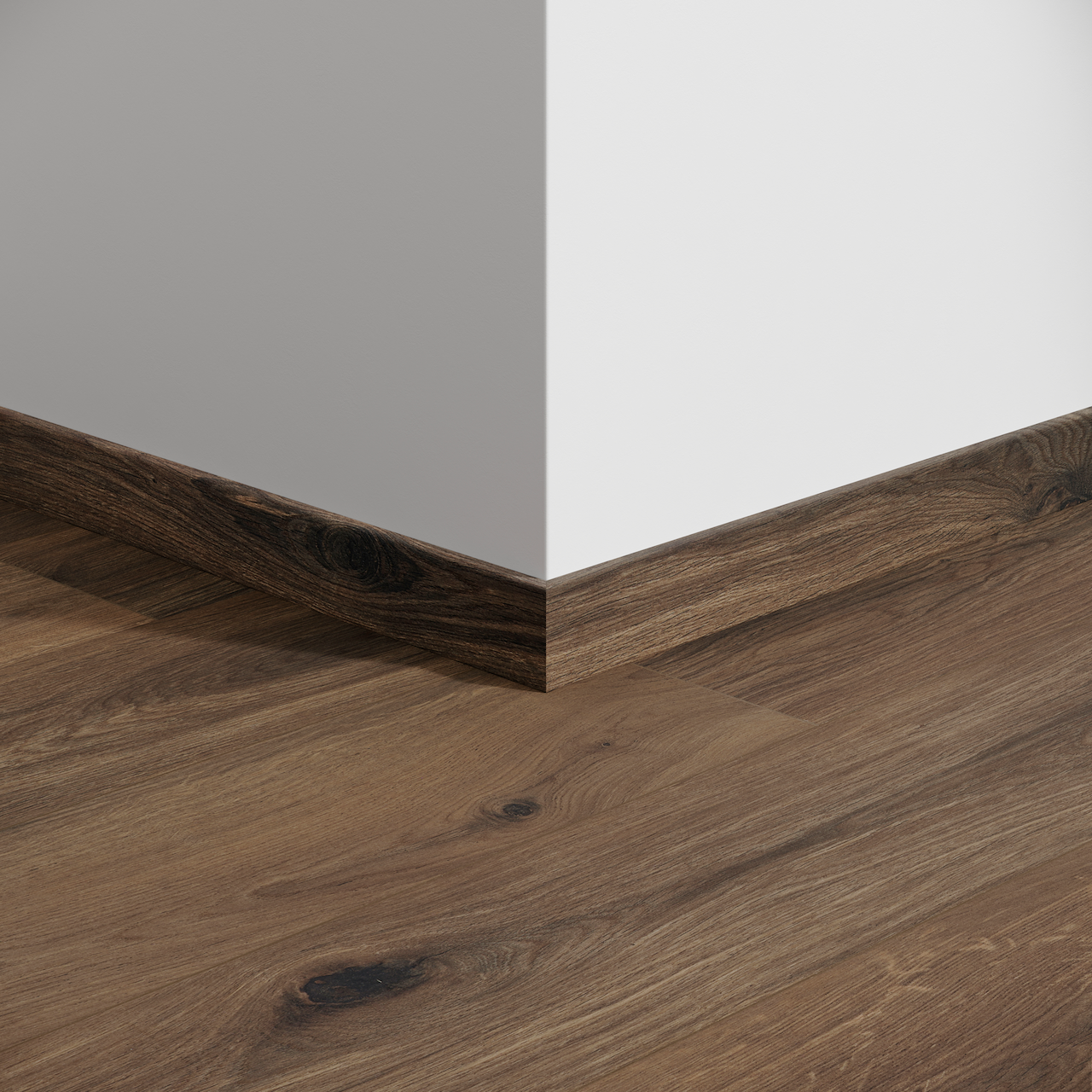 Disse sokkellistene fra BerryAlloc passer til gulv i samme dekor, og gir rommet et helhetlig uttrykk. Listene installeres med lim eller clips.