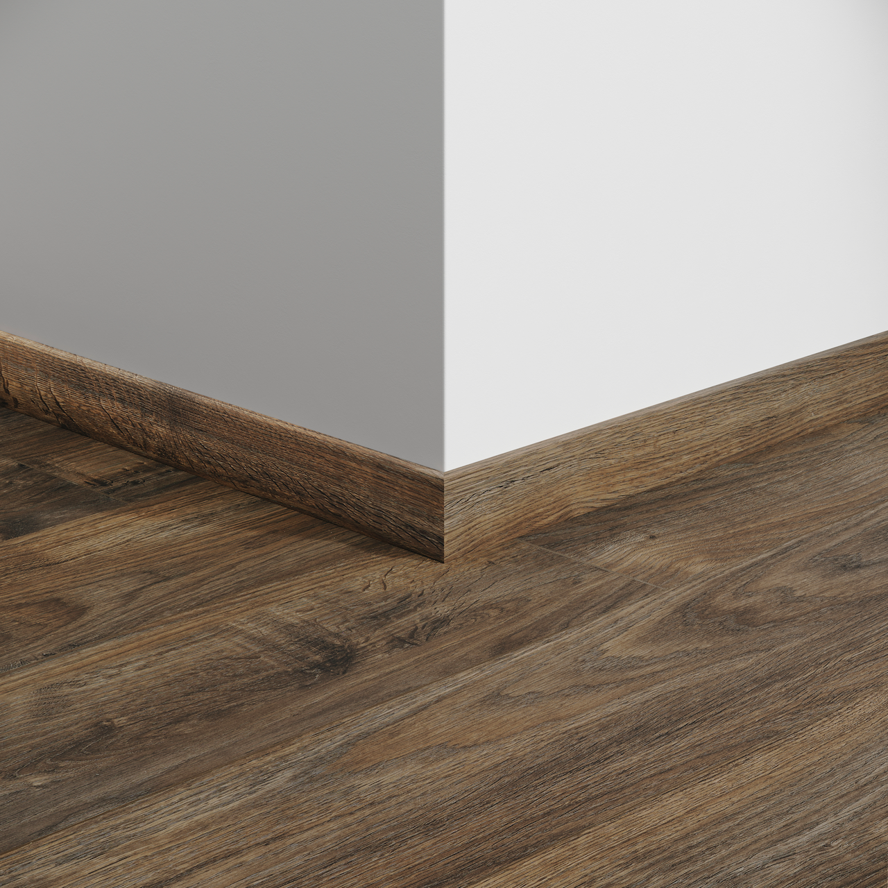 Disse sokkellistene fra BerryAlloc passer til gulv i samme dekor, og gir rommet et helhetlig uttrykk. Listene installeres med lim eller clips.