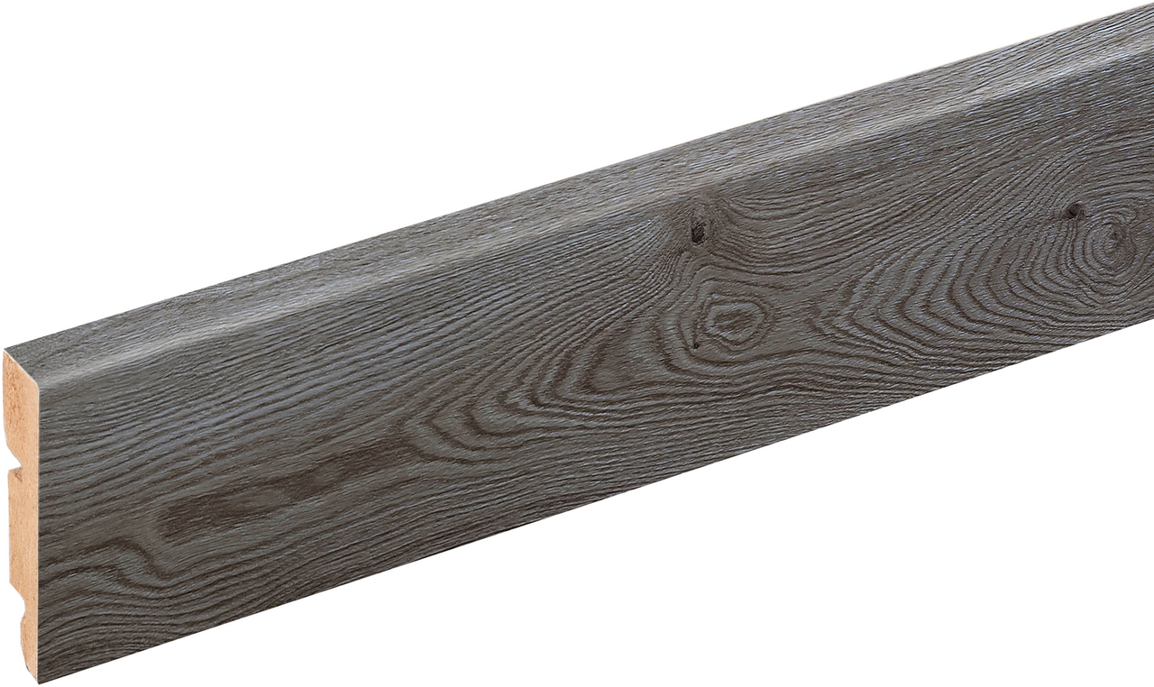 Disse sokkellistene fra BerryAlloc passer til gulv i samme dekor, og gir rommet et helhetlig uttrykk. Listene installeres med lim eller clips.