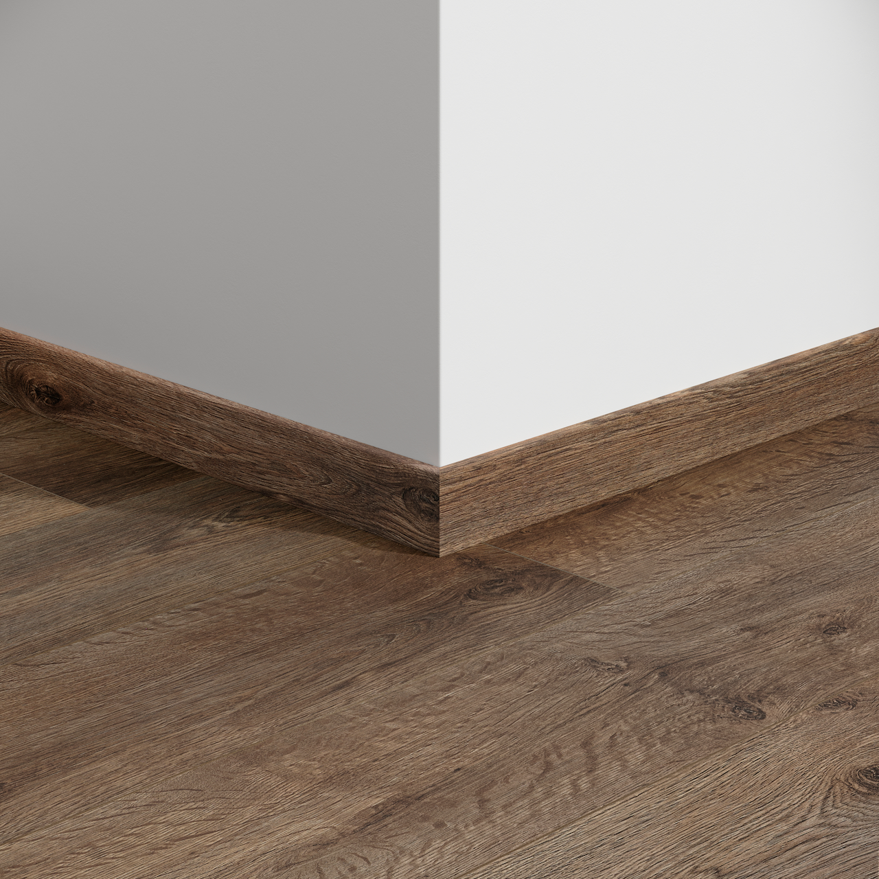 Disse sokkellistene fra BerryAlloc passer til gulv i samme dekor, og gir rommet et helhetlig uttrykk. Listene installeres med lim eller clips.