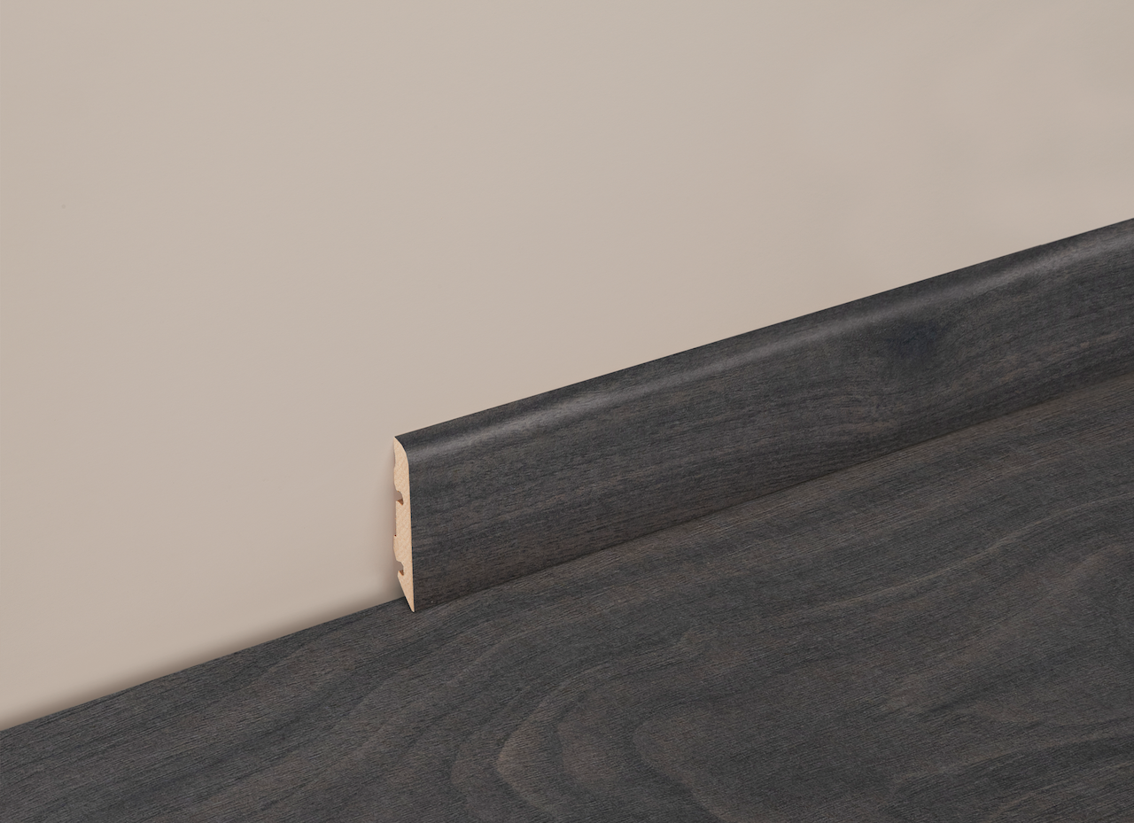 Disse sokkellistene fra BerryAlloc passer til gulv i samme dekor, og gir rommet et helhetlig uttrykk. Listene installeres med lim eller clips.