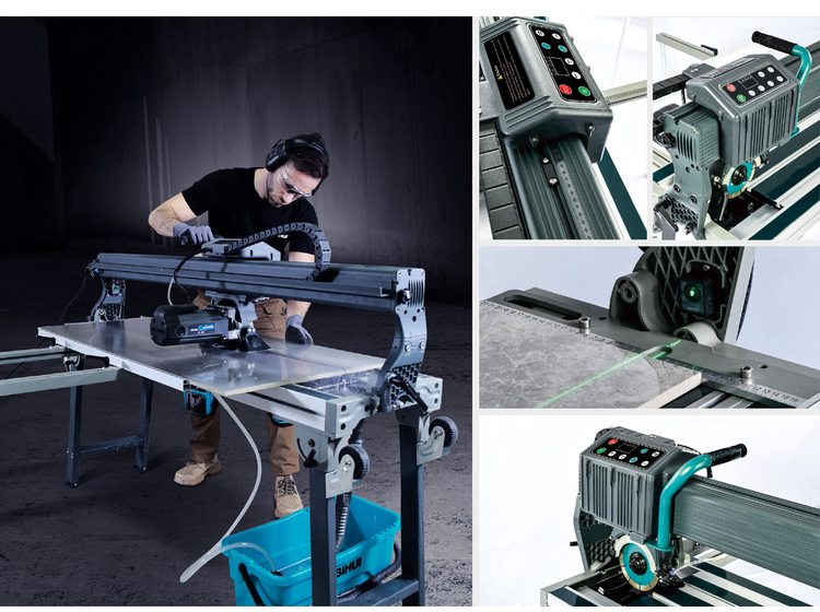 Den er utstyrt med hev- og senkbar motor, styreskinne for jollykutt, laser for presisjon, og en innebygd vannpumpe for effektiv kjøling. Sammenleggbar benstøtte med hjul gir enkel transport, mens fire støttearmer med linjal og støttevinkel muliggjør nøyaktig 45° kapping. Den leveres med 120 mm diamantblad.