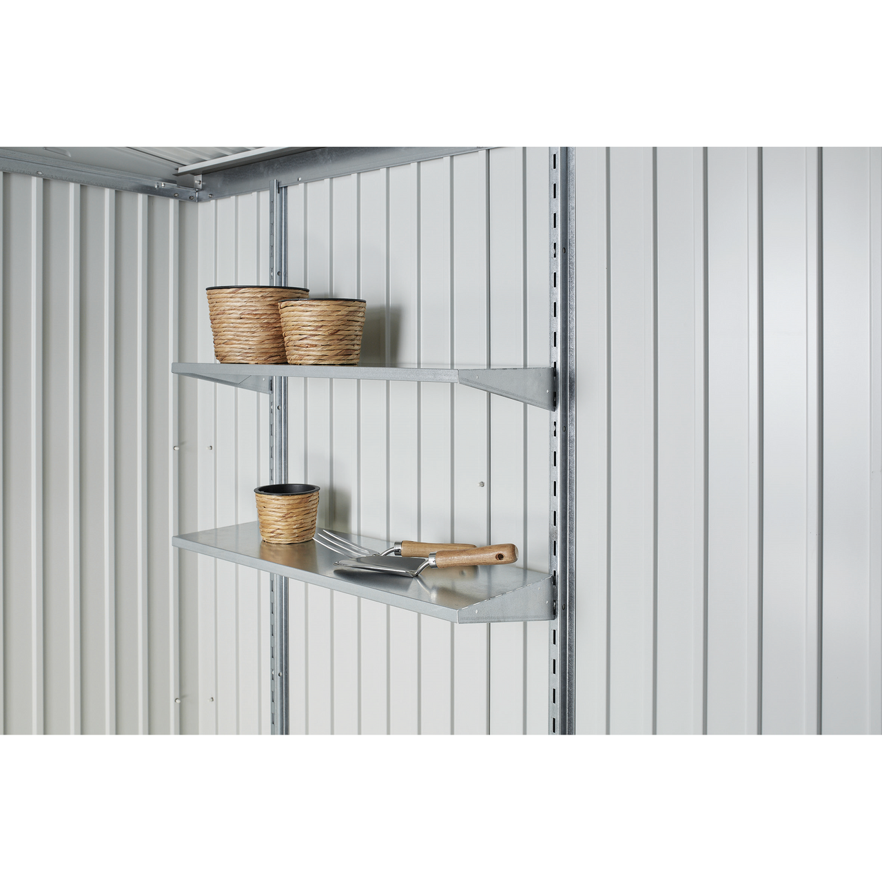 Mangler du plass til mindre ting i din Biohort redskapsbod, så er et hyllesett som dette en meget praktisk og funksjonell løsning. Hyllen i varmtgalvanisert stål tåler en maks belastning på 15 kg pr hylle. Hyllesettet inneholder 2 hyller med hyllebraketter og monteringsutstyr inkludert, veggskinner til montering må kjøpes separat.