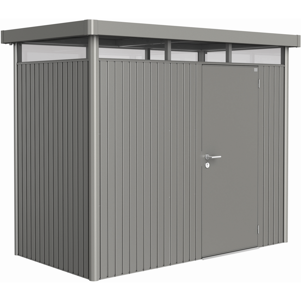 Redskapsbod av høy kvalitet med moderne design og elegant overlys hele veien rundt. Dette er den ultimate uteboden som oppfyller alle kravene for sikkerhet og funksjonalitet, ikke minst er den 100% vedlikeholdsfri. Boden er laget av varmgalvaniserte, polyamidbelagte stålplater og har skruer, bolter og hengsler av rustfritt stål. De solide materialene gjør boden motstandsdyktig mot snømengder opp til 150 kg pr m2. Redskapsboden kommer med 2 stk verktøyholder, 4 stk verktøyhenger og 2 hyller med beslag.