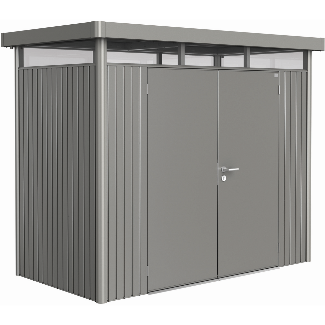Redskapsbod av høy kvalitet med moderne design og elegant overlys hele veien rundt. Dette er den ultimate uteboden som oppfyller alle kravene for sikkerhet og funksjonalitet, ikke minst er den 100% vedlikeholdsfri. Boden er laget av varmgalvaniserte, polyamidbelagte stålplater og har skruer, bolter og hengsler av rustfritt stål. De solide materialene gjør boden motstandsdyktig mot snømengder opp til 150 kg pr m2. Redskapsboden kommer med 2 stk verktøyholder, 4 stk verktøyhenger og 2 hyller med beslag.