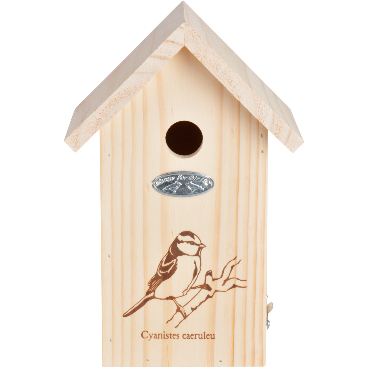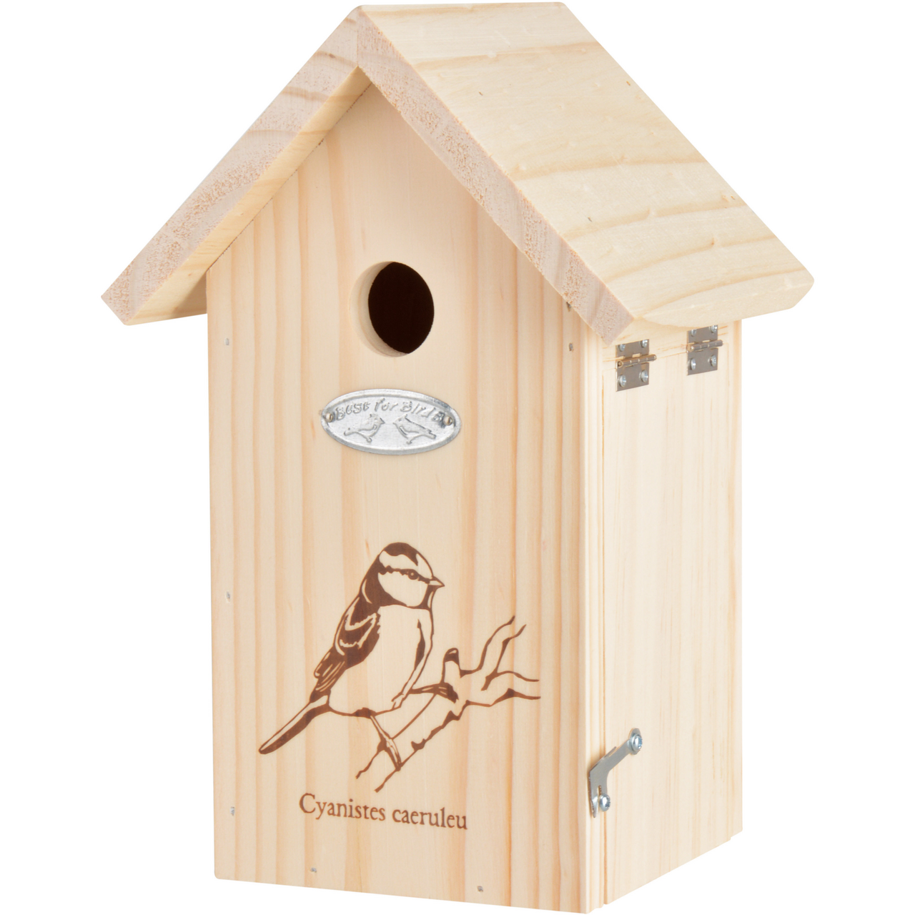 Taket beskytter mot regn og snø, mens åpningen gir småfugler et trygt sted å bygge rede. Lokket kan enkelt åpnes for rengjøring etter hekkesesongen.