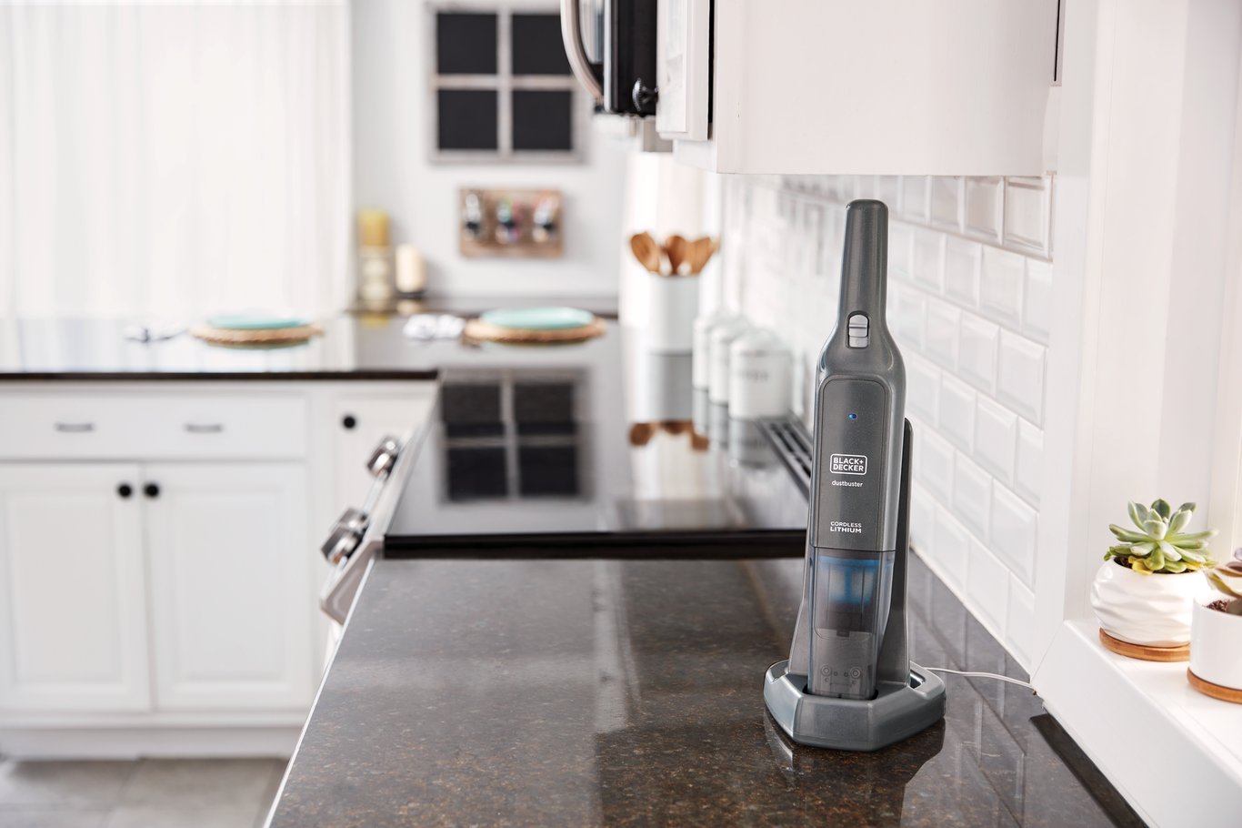 Denne håndstøvsugeren fra Black+Decker er oppladbar og har et slankt design. Den poseløse støvbeholderen er gjennomsiktig, og gjør det enkelt å se når den må tømmes.