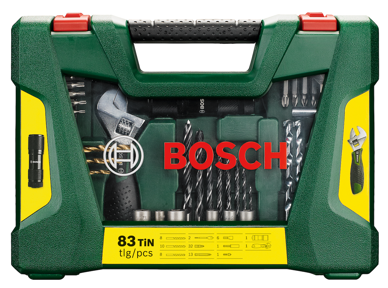 Dette bor- og bitssettet fra Bosch består av 83 deler, for det meste av bore- og festearbeider i tre, stein og metall. Settet kommer i en praktisk Bosch V-Line-koffert, hvor det også følger med en universalnøkkel og en LED-lommelykt.