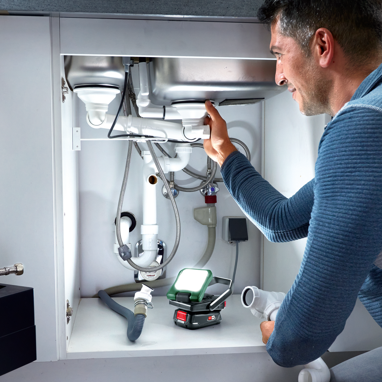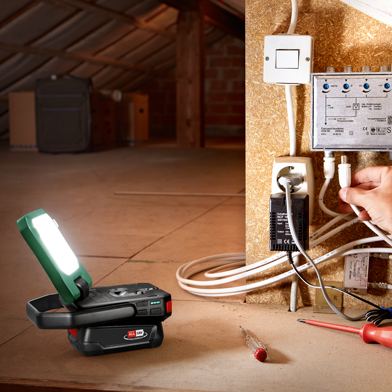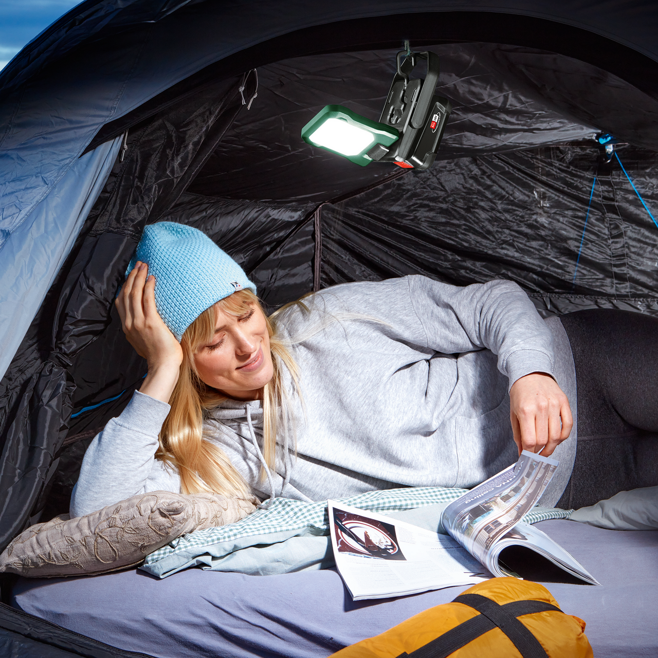 Med 400 lumen, tre lysstyrkenivåer og justerbar fargetemperatur gir den fleksibel belysning. Den har et 180° vippe- og 360° dreiebart hode, magneter og krok for enkel plassering, og kan brukes som nødlader for enheter via USB-C. Lampen er en del av 18V POWER FOR ALL-systemet, hvor ett batteri passer til alle verktøy.