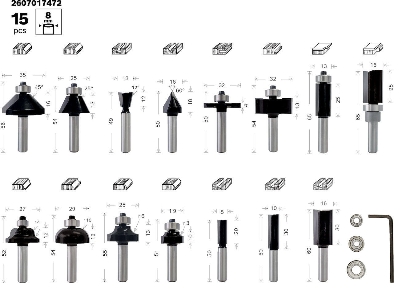 - Type: fresebit, flush trim bit, flush mønster bit, dovetail bit, chamfer bit, V-groove bit, sporfres, fals, romersk ogee bit, cove bit, avrunding over bit, rett bit 2 fres, rett bit 3 cutter