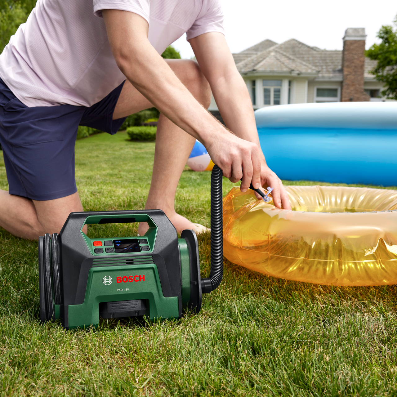 Denne luftkompressoren fra Bosch leverer høytrykkseffekt for oppblåsing av dekk og volumpåfyllingsapplikasjoner som store gummibåter.