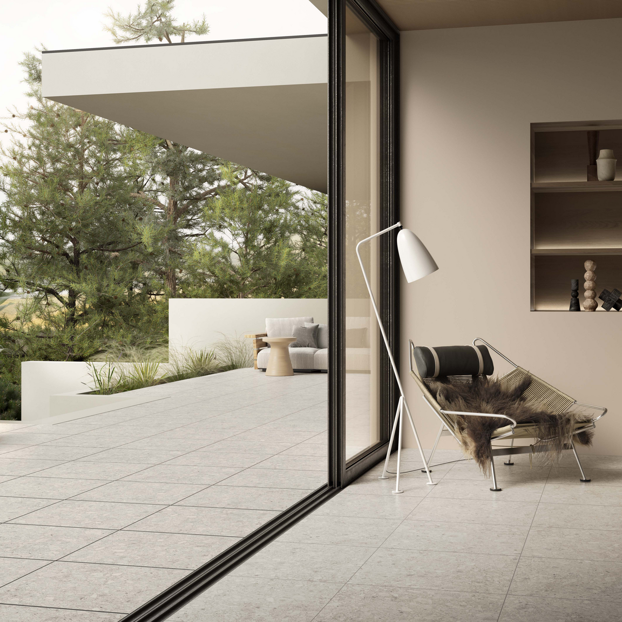 Denne porcellanatoflisen fra italienske Casalgrande Padana egner seg godt til bruk på terrasser eller i hager. Flisene har en lys, sklisikker overflate med terrazzo-imitasjon.