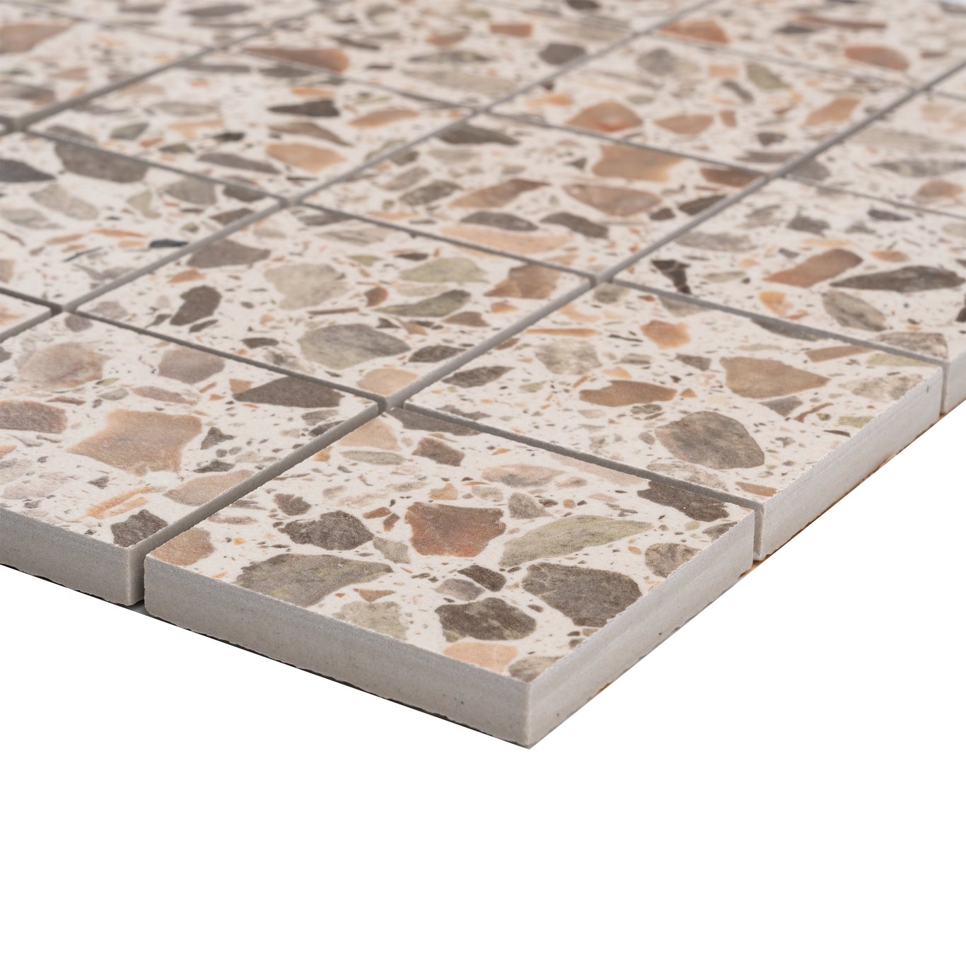 Terrazzo-serien fra italienske Casalgrande Padana har en slitesterk overflate med terrazzo-effekt. Denne mosaikken i størrelse 6 x 6 har en matt finish.