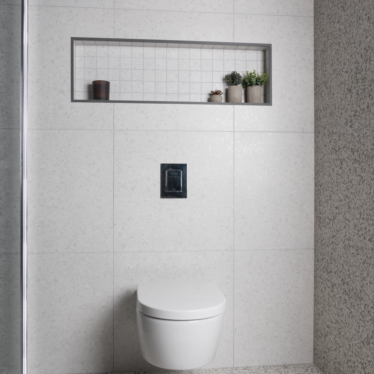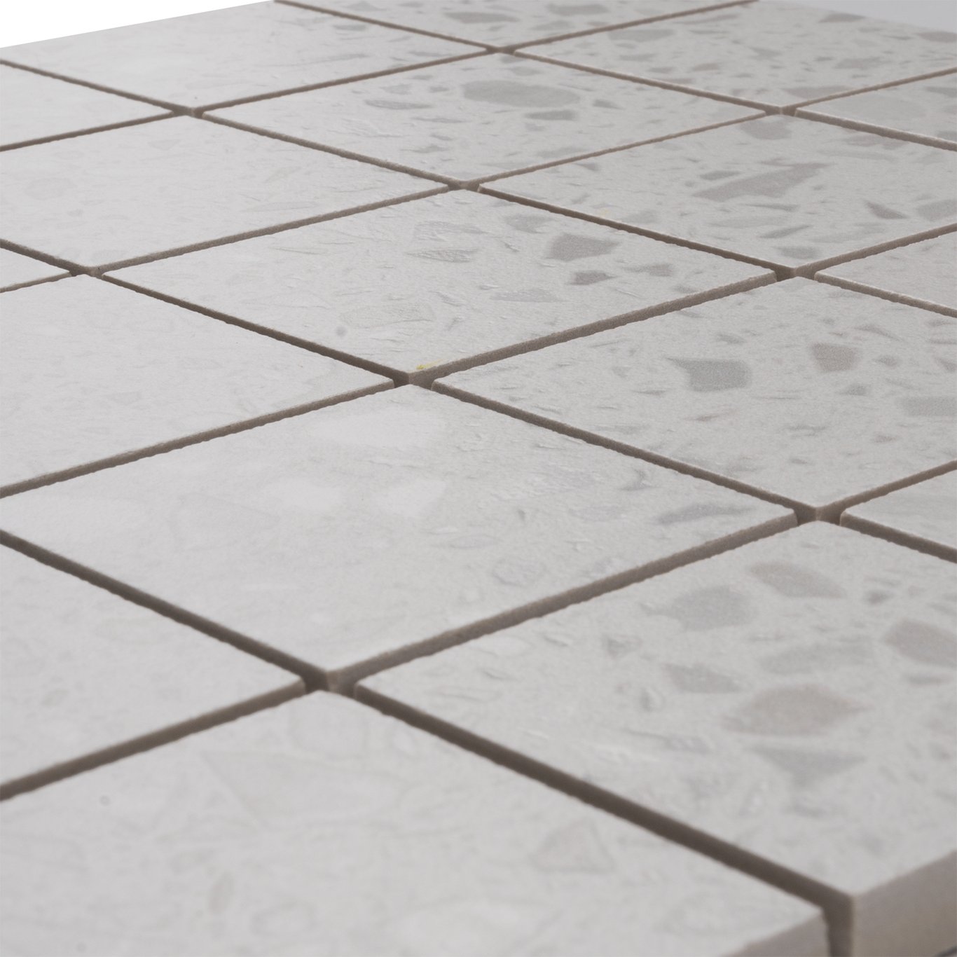 Terrazzo-serien fra italienske Casalgrande Padana har en slitesterk overflate med terrazzo-effekt. Denne mosaikken i størrelse 6 x 6 har en matt finish.