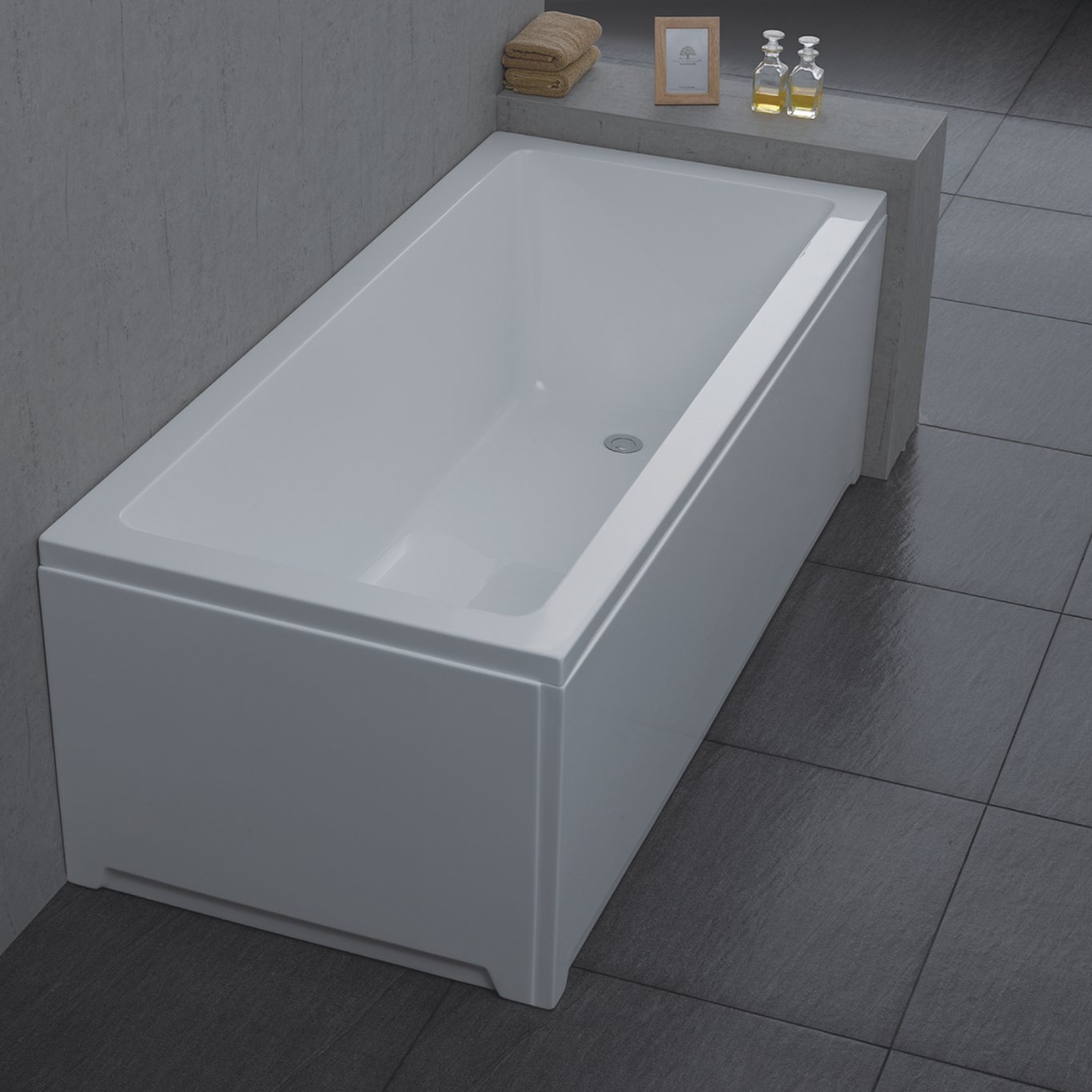 Tradisjonelt badekar i akryl. Badekaret leveres med fastmontert frontpanel, samt endepanel montert på venstre side.
