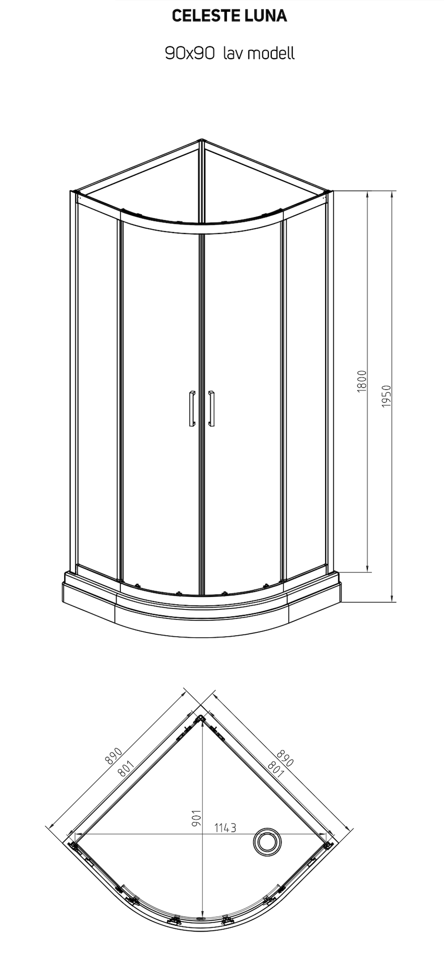CELESTE LUNA BUET DUSJKABINETT 90X90X195 CM LAV MODELL, KROM