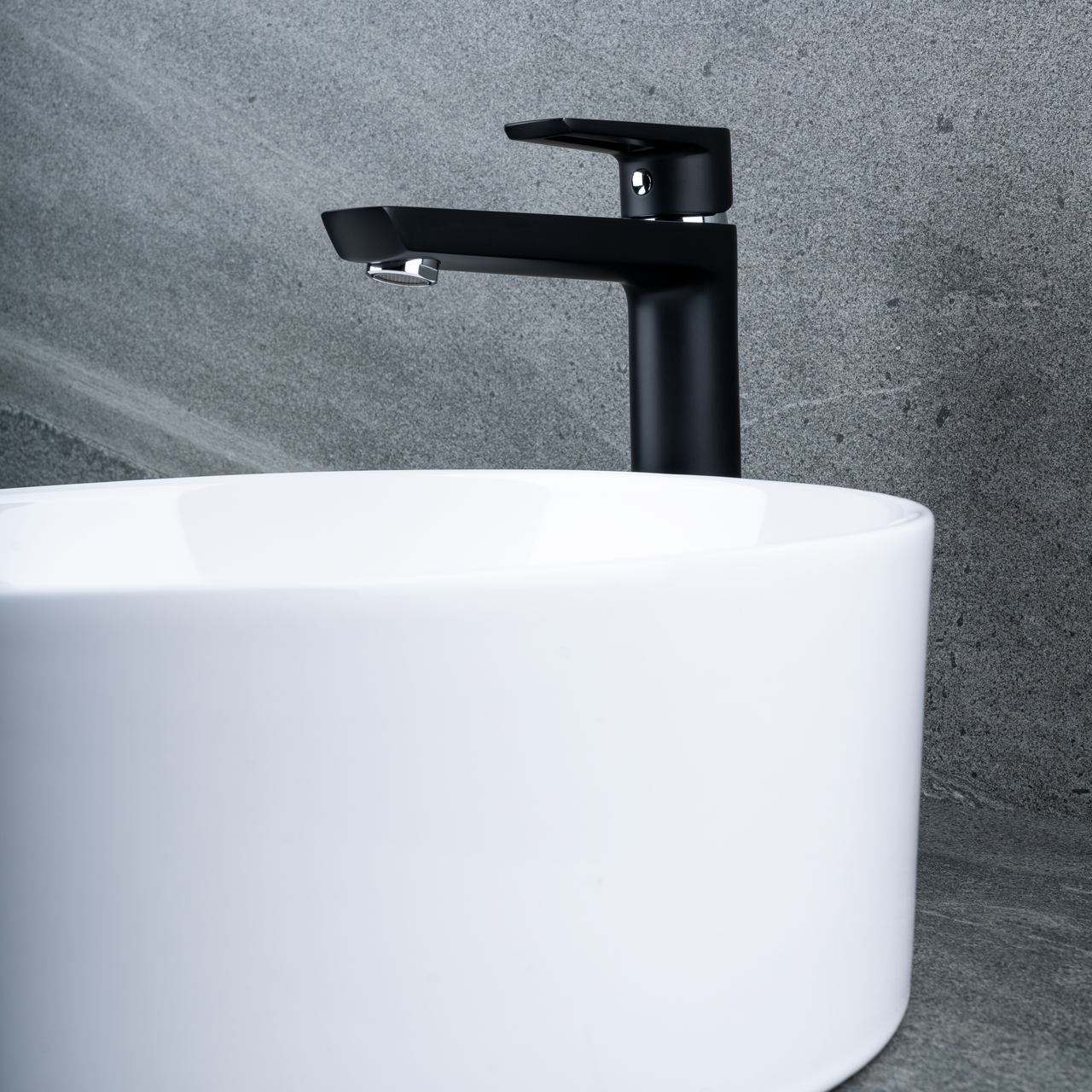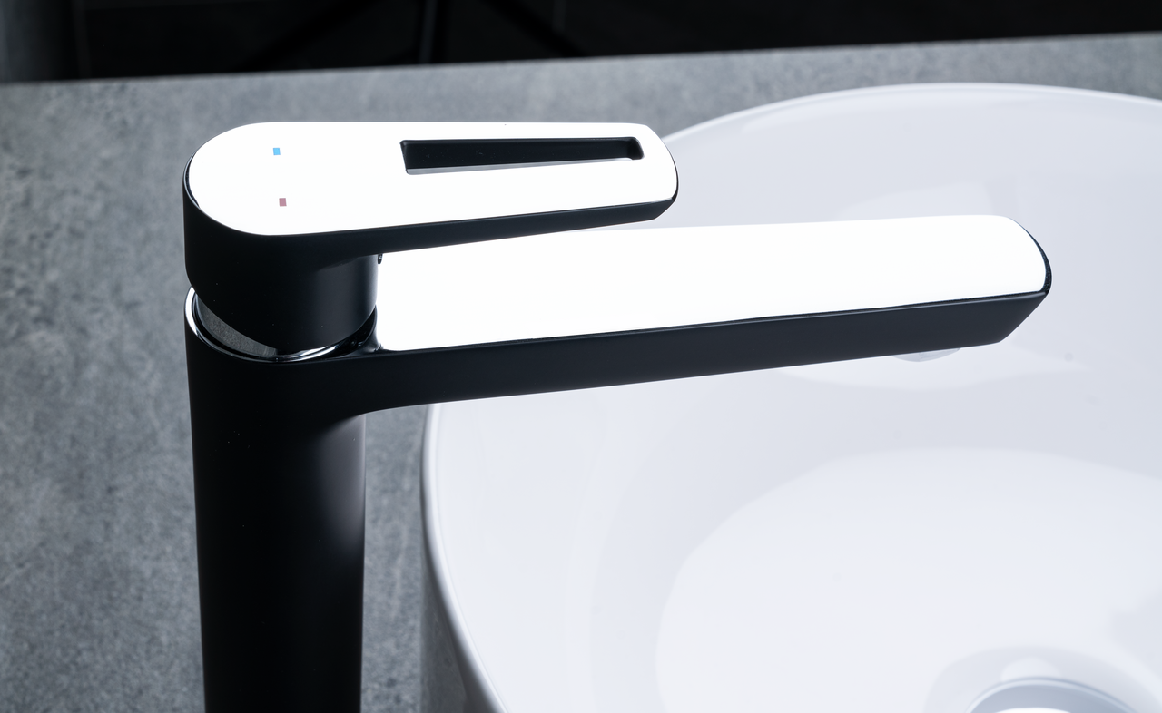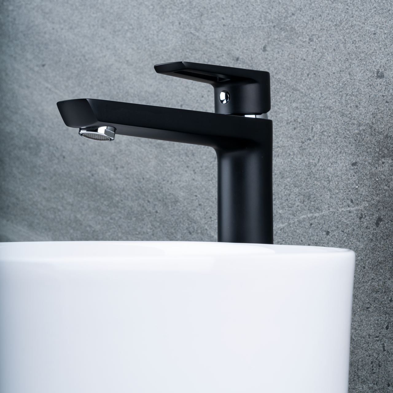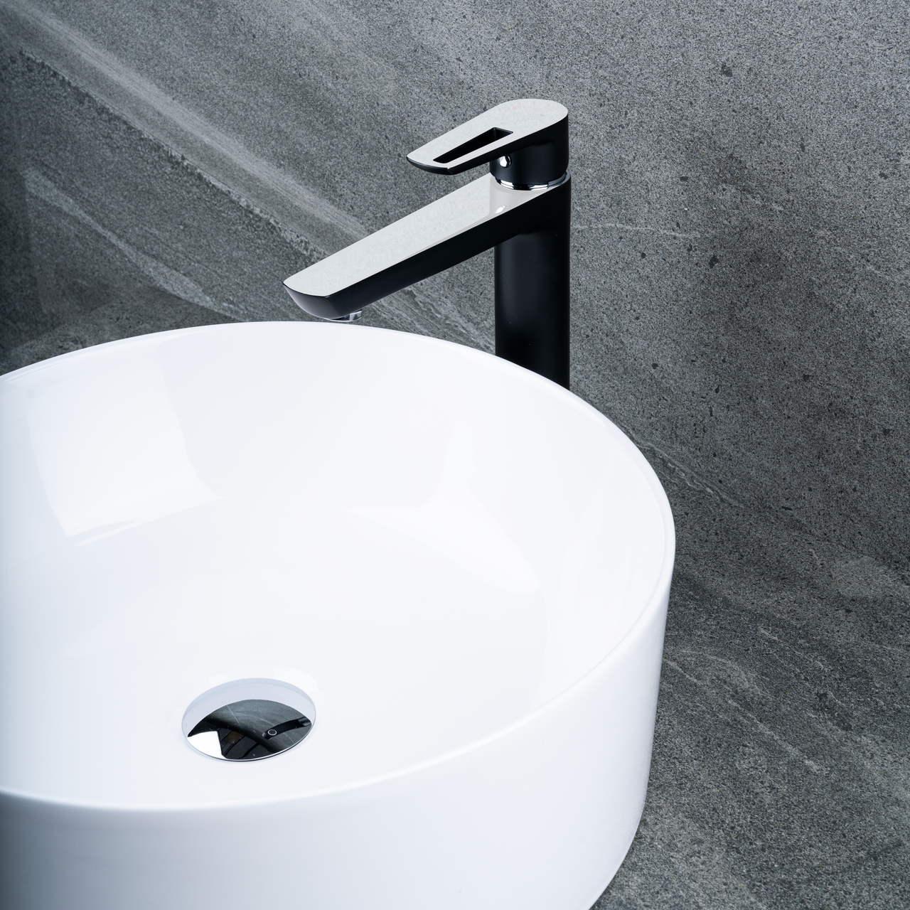 Dette servantbatteriet fra Celeste har et moderne design og rene linjer, i en elegant krom og matt sort utførelse. Sammen med en frittstående servant skaper den en moderne helhet på badet.