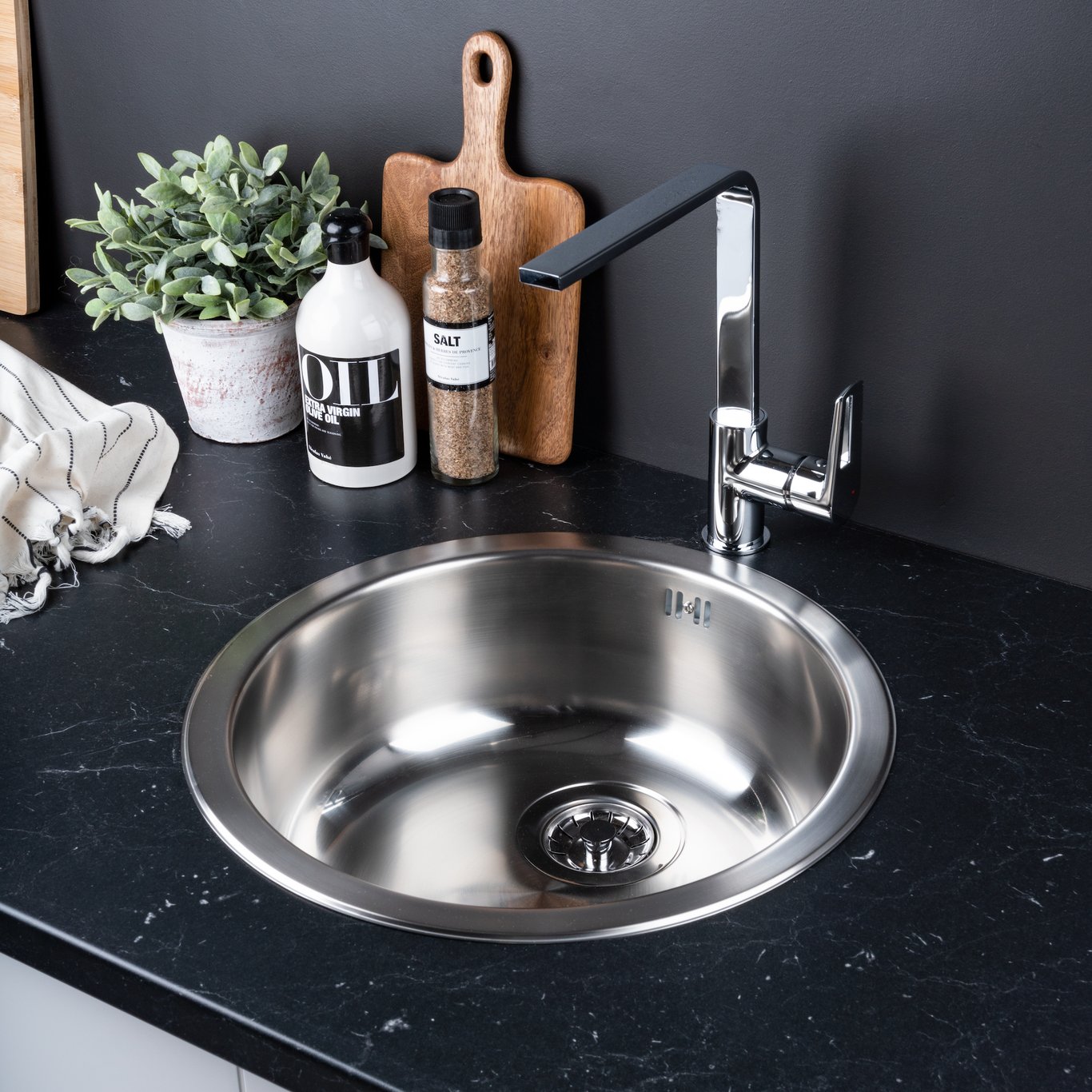 Elegant rund stålvask fra Celeste. Her får du en kompakt kjøkkenvask med en slitesterk overflate.