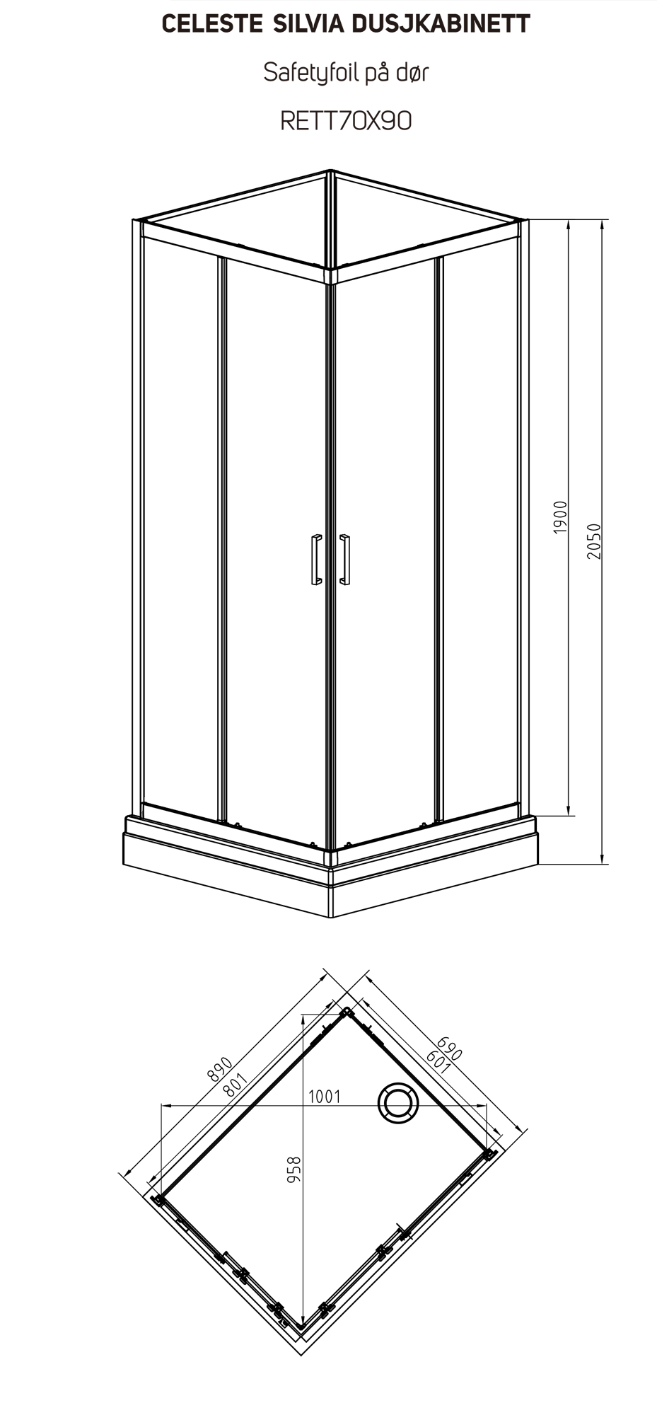 Celeste silvia rett dusjkabinett 70x90x205cm m/sikkerhetsolie, krom