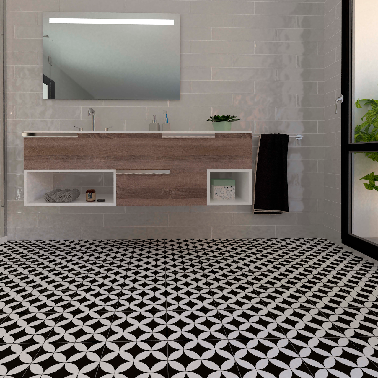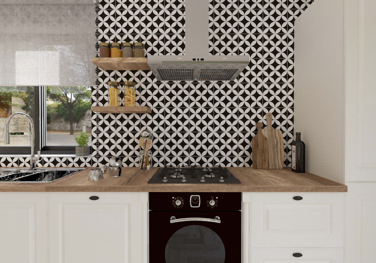 Kioto Negro er en mønstret, sort og hvit porcellanatoflis i størrelse 22,5x22,5 cm. Flisen bidrar til et stilfullt uttrykk i både moderne og mer klassiske hjem.