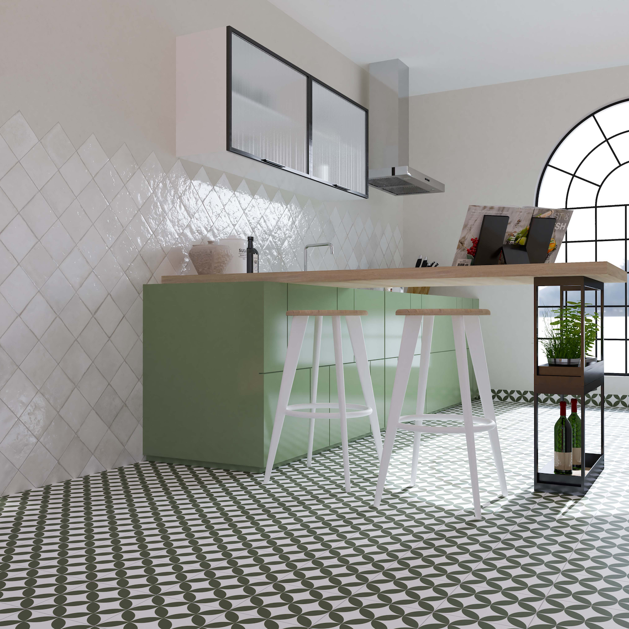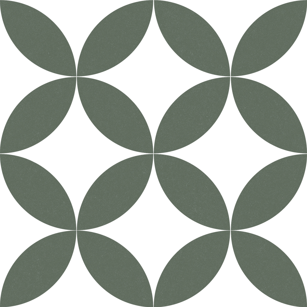Tokio Olive er en mønstret, olivengrønn og hvit porcellanatoflis i størrelse 22,5x22,5 cm. Flisen gir et stilfullt uttrykk i både moderne og mer klassiske hjem.
