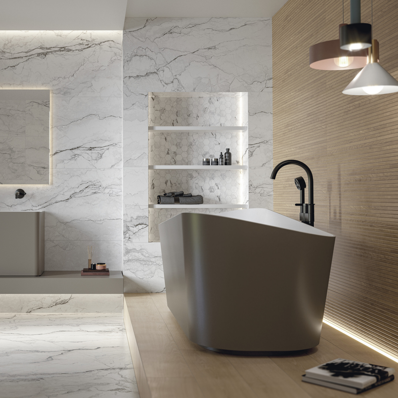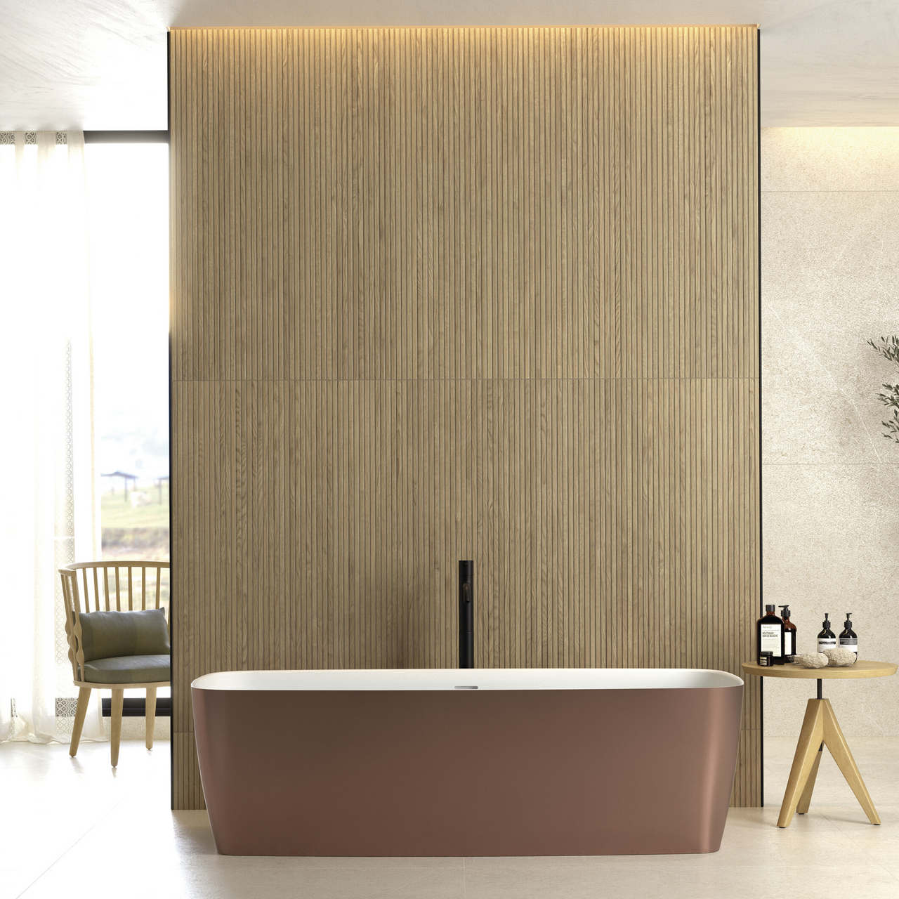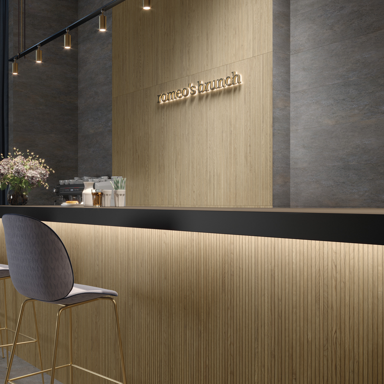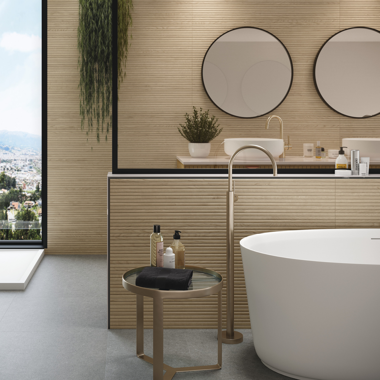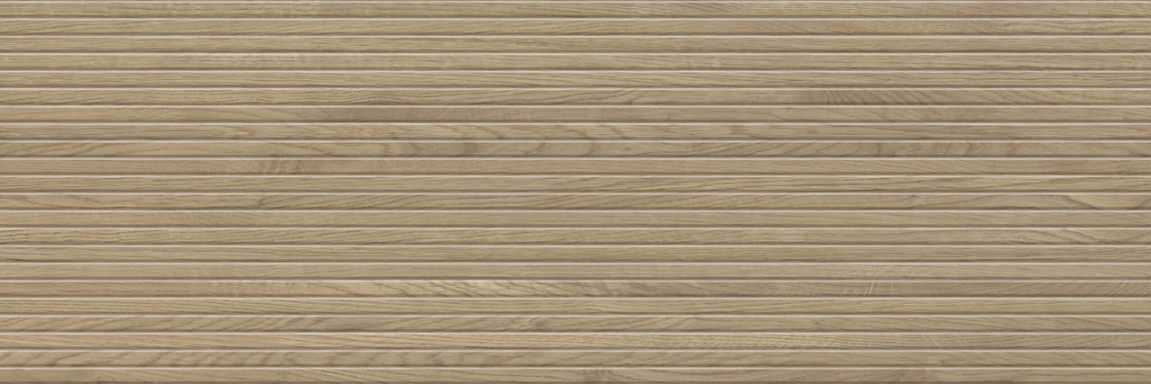 Flisens lineære tremønster minner om spiler, noe som gir et moderne og stilrent uttrykk. Flisen er egnet til de fleste typer vegger innendørs.