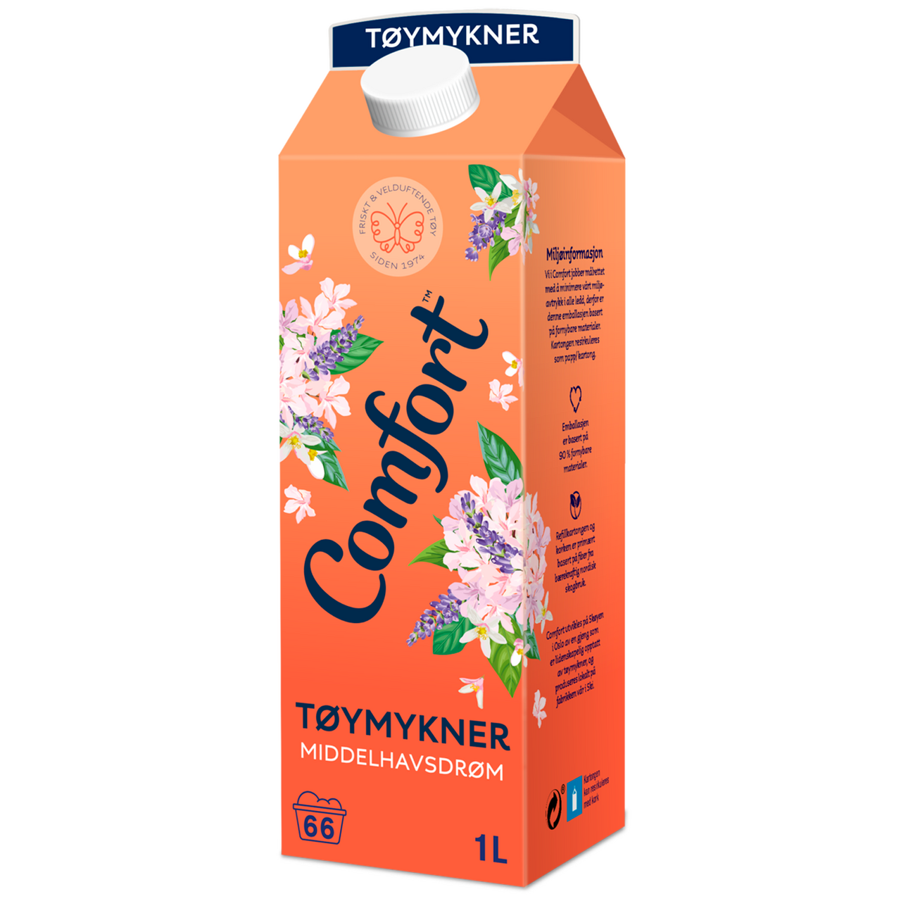 Comfort Middelhavsdrøm med duft av sitrus og søte frukter. Skyllemiddelet gjør tøyet mykt og mindre statisk.