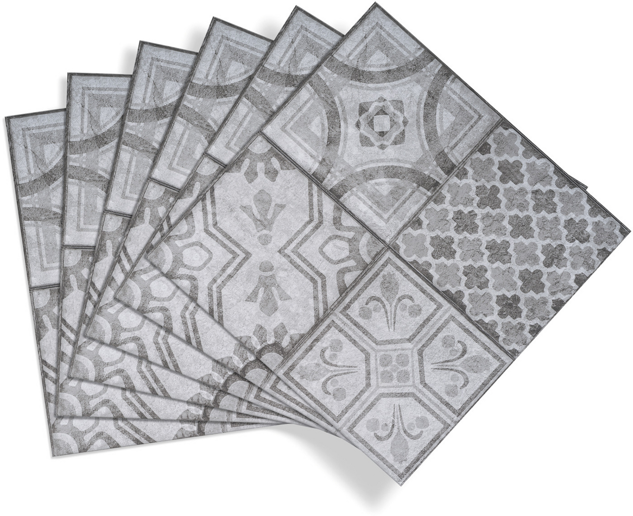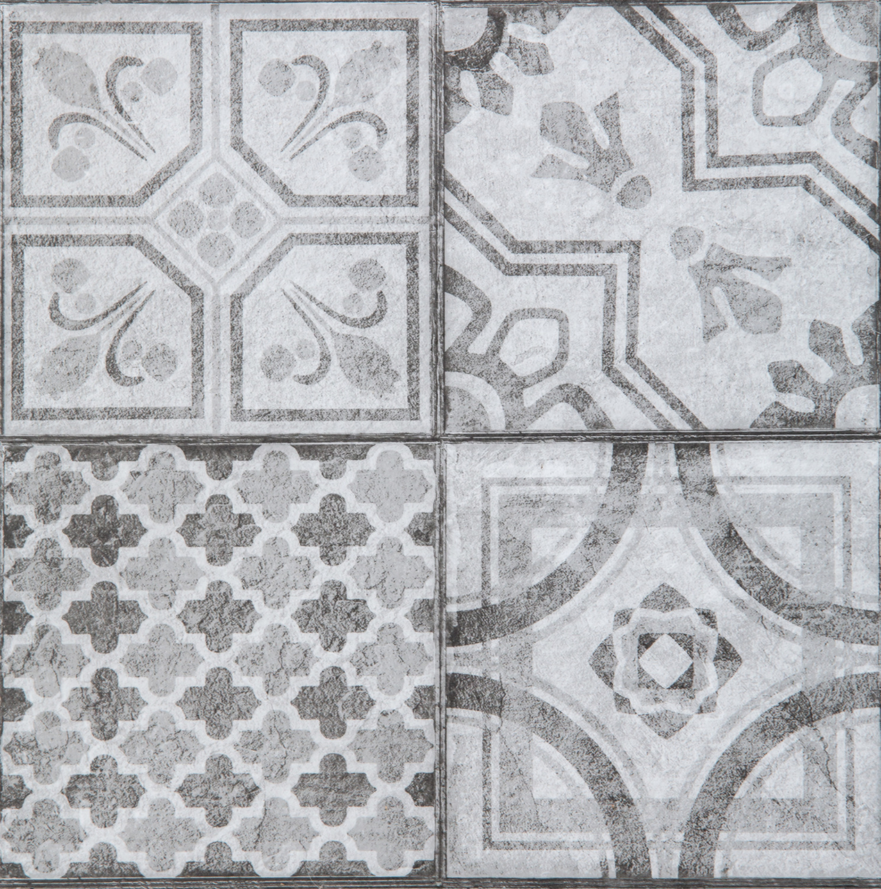 Selvklebende vinylfliser fra D-C-Fix, som gjør det enkelt å freshe opp gulvet og skape et nytt uttrykk i rommet. Overflaten består av ulike mønstre i flere gråtoner.