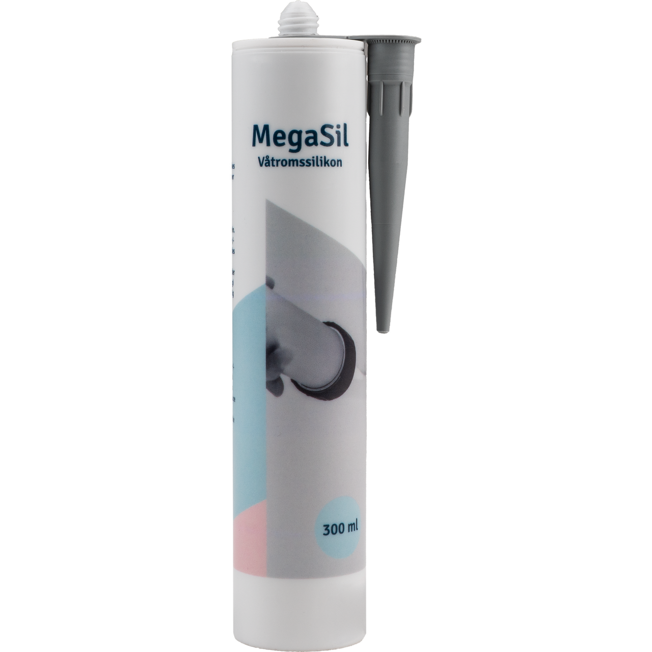 MegaSil våtromsilikon er en nøytral høyelastisk fugemasse. Tilsatt fungicid, som er et sopphemmende middel. Luktfri. Brukes i våtrom, dusjkabinett, mellom sanitære installasjoner m.m. Ekstrem god vedheft til keramiske fliser, glatt emalje, glass, glatte flater, baderoms paneler m.m. Kan også benyttes på naturstein. Porøse/sugende flater bør primes. Tåler bevegelse på +/- 25%. Arbeidstemperatur: +5°C til +40°C. Skal bearbeides hurtigst mulig etter påføring.Bearbeidelse: Fuges på fast, tørt, rent og fettfritt underlag.Advarsel: Kan utløse allergisk reaksjon.Inneholder oxim.Innhold: 300 ml.Ikke overmalbar.