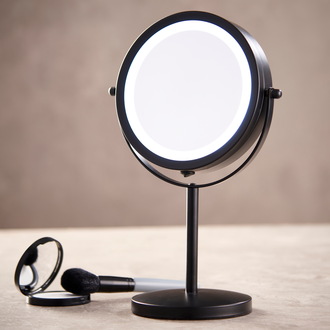 Speilet er dobbeltsidig, med en vanlig speilflate på den ene siden og 5x forstørrelse på den andre. Ideelt for detaljert sminke, hudpleie eller barbering.