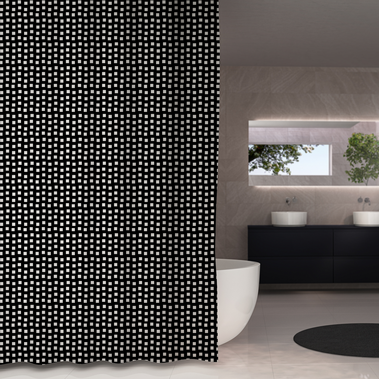 Dette dusjforhenget fra Debel har et moderne mørkegrått design, med innslag av hvite små firkanter. Det har et innsydd tyngdebånd i bunnen, slik at det alltid henger pent.