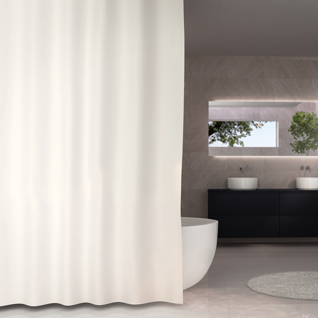 Dette dusjforhenget fra Debel har et enkelt hvitt design uten store detaljer, som gjør det universelt og passende for de fleste baderom. Det har et innsydd tyngdebånd i bunnen, slik at det alltid henger pent.