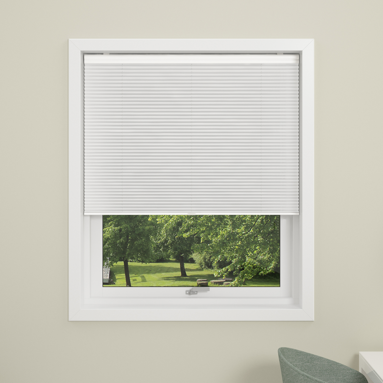 Touch plissè er en ensfarget plisségardin uten betjeningssnøre. Plisségardinen betjenes enkelt ved å trekke spaken på undersiden.