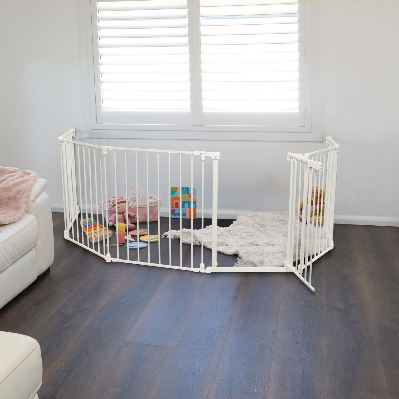 Denne lekegrinden består av 6 solide metallpaneler og kan brukes både som frittstående grind, som peisbeskyttelse eller som romdeler når den monteres med beslag, og den kan enkelt tilpasses ulike behov og romløsninger med en maksimal bredde på 3,8 meter, samtidig som den er lett å folde sammen.