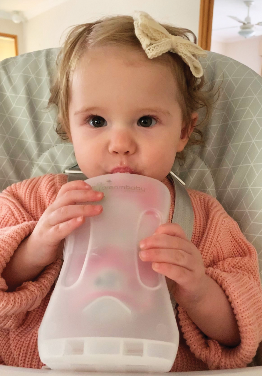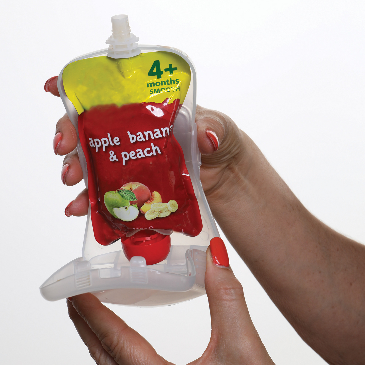 Med denne drikkebeholderen fra Dreambaby unngår du søl fra klemposer og lar barnet ditt trygt utforske og lære å spise selv.