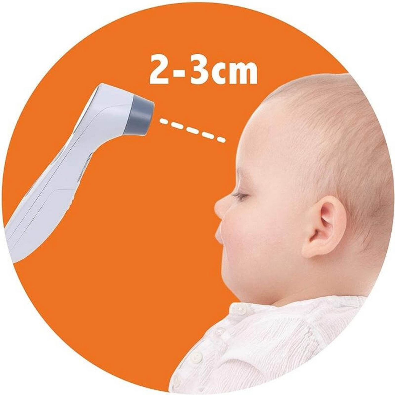 Hold det 2–3 cm fra pannen for en presis avlesning. LCD-skjermen viser tre farger, har en feberalarm og gir en hørbar bekreftelse når målingen er klar. Termometeret lagrer de siste 10 målingene og slår seg automatisk av.