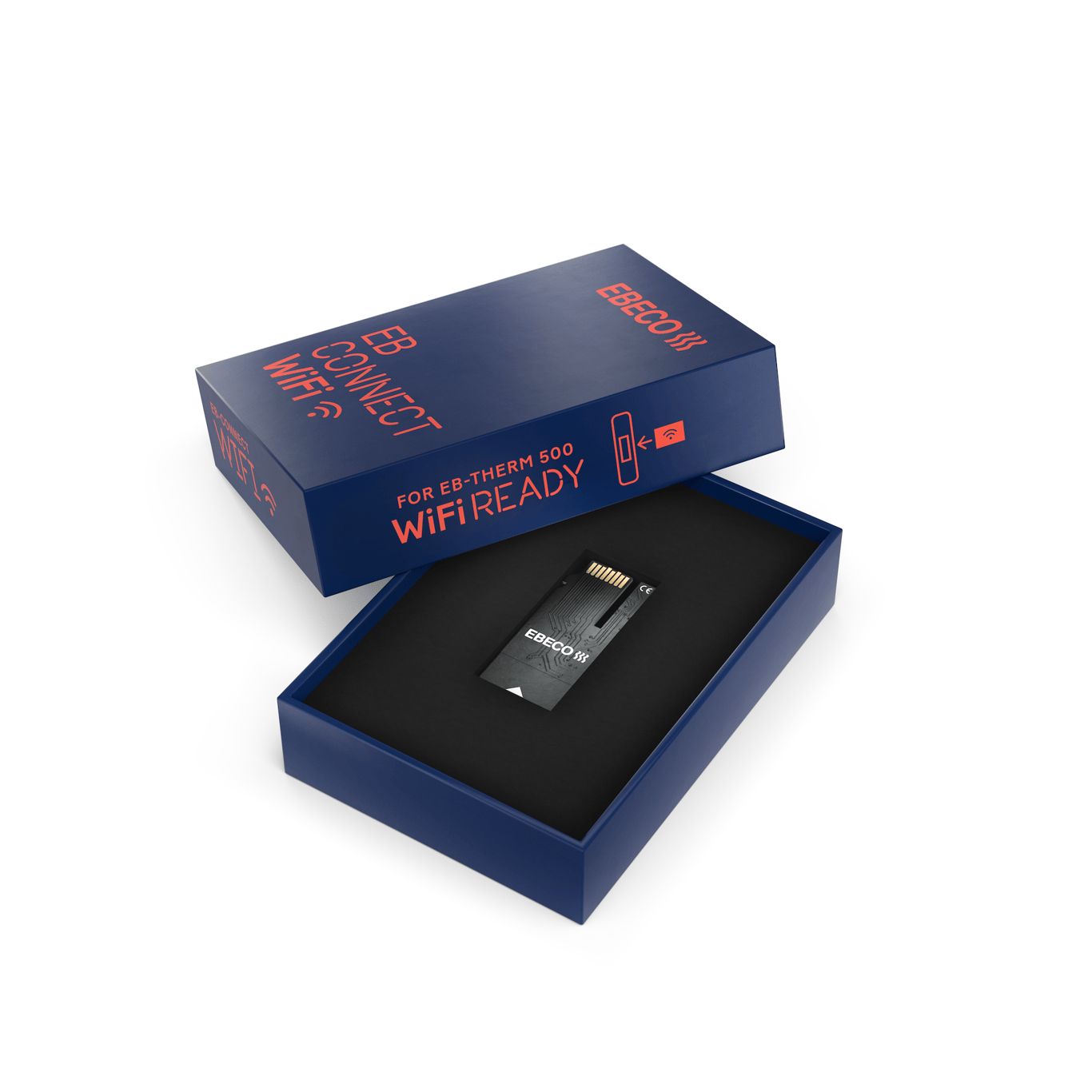 Denne WiFi-modulen fra Ebeco settes inn i termostaten EB-Therm 500, og lar deg enkelt gjøre gulvvarmetemostaten til et system som kan styres via appen Ebeco Connect eller det åpne API-et.