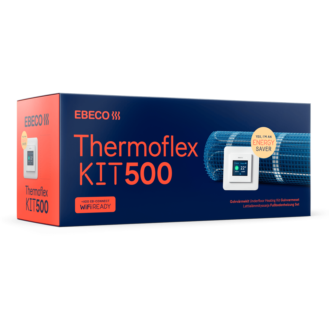 Thermoflex Kit 500 er gulvvarmekabel på selvklebende matte som er lett å rulle ut. Den WiFi-klargjorte termostaten EB-Therm 500 inngår i settet. Hvis du kjøper til tilbehøret EB-Connect WiFi, kan du styre gulvvarmen via appen Ebeco Connect eller via åpent API.