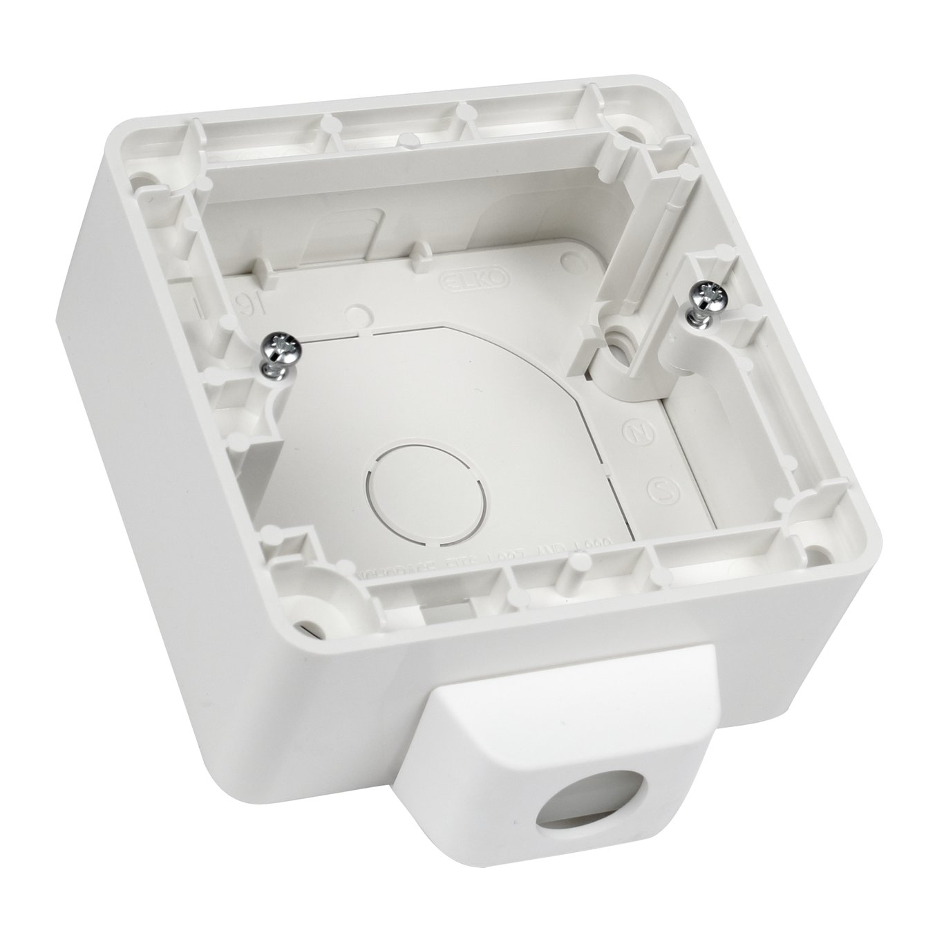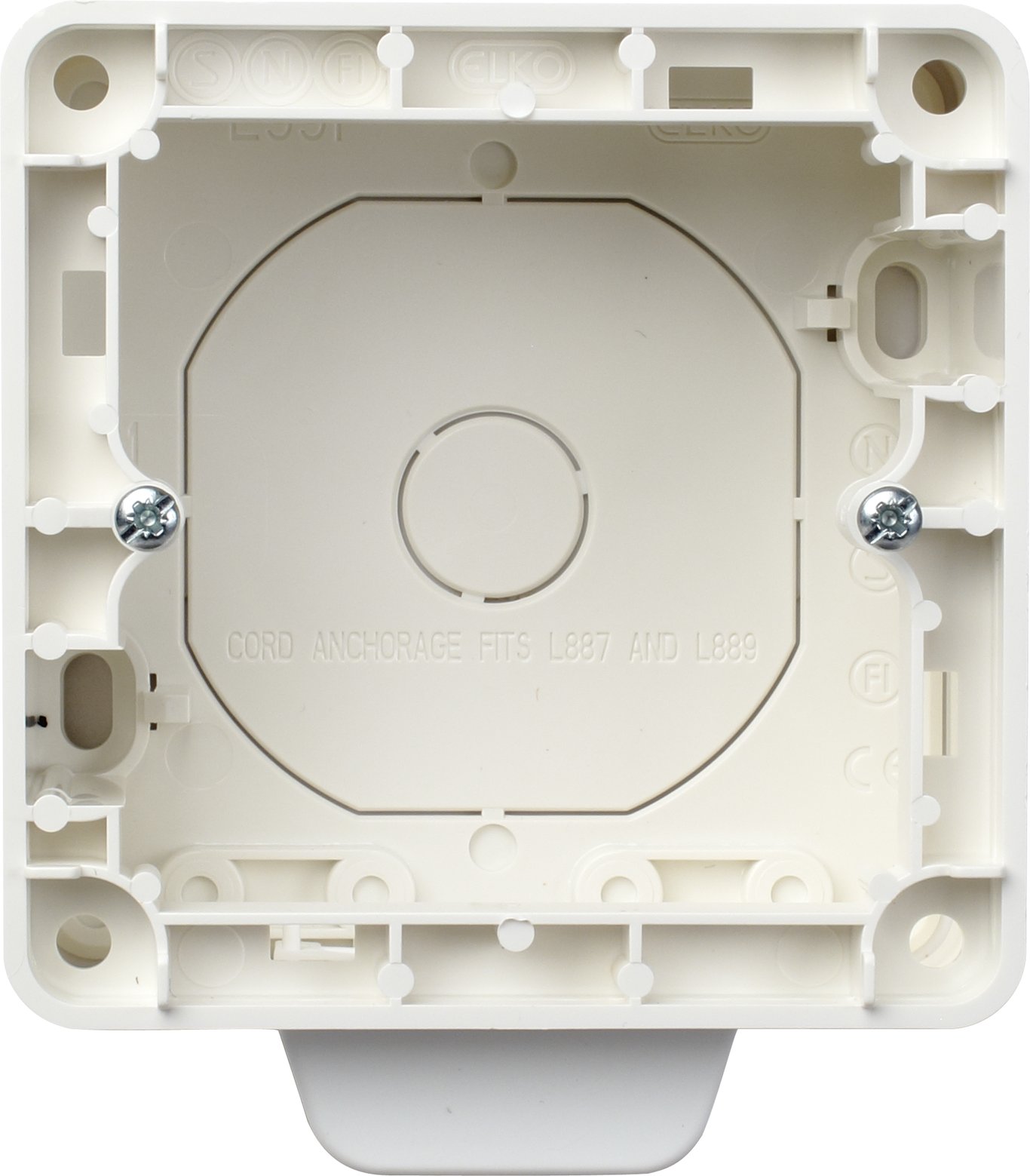Denne påveggskappen fra Elko har integrert strekkavlaster. Den er perfekt til blant annet VVB, i kombinasjon med av/på-bryter med lys, hvor tilførselskabel fra varmtvannsbereder føres inn i kappen via strekkavlasteren og termineres direkte på bryteren.