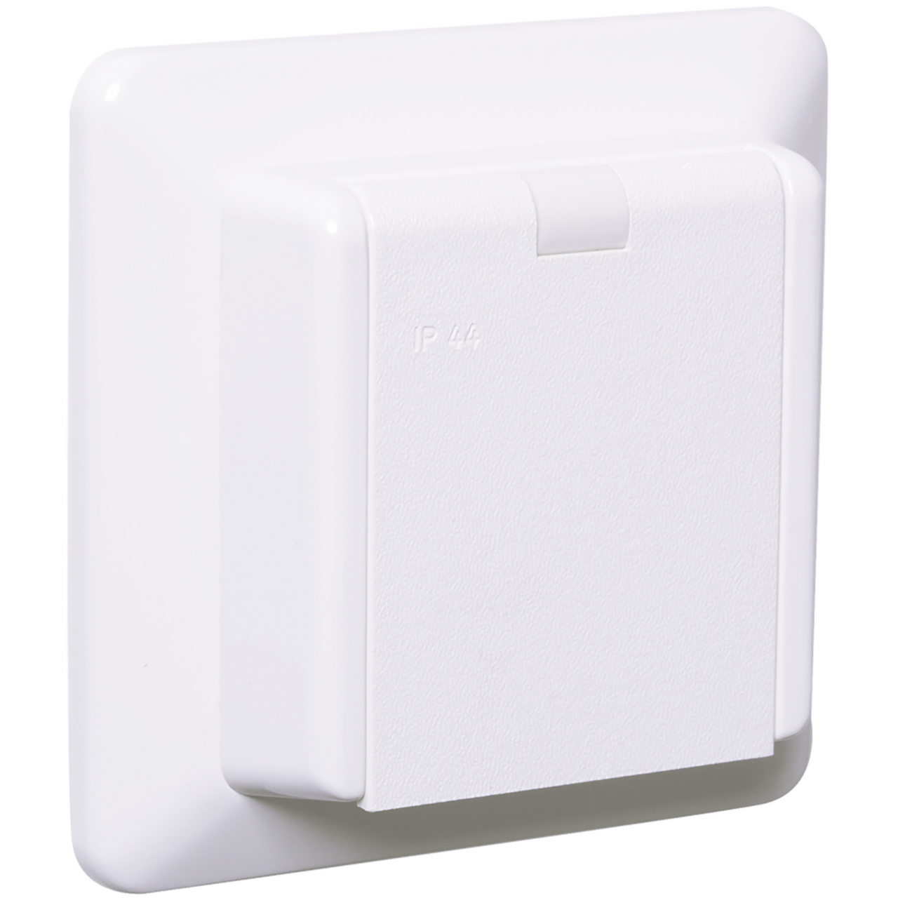 RS Renhvit sprutsikker stikkontakt IP44 innfelt med klapplokk og barnevern som monteres i enkel veggboks.