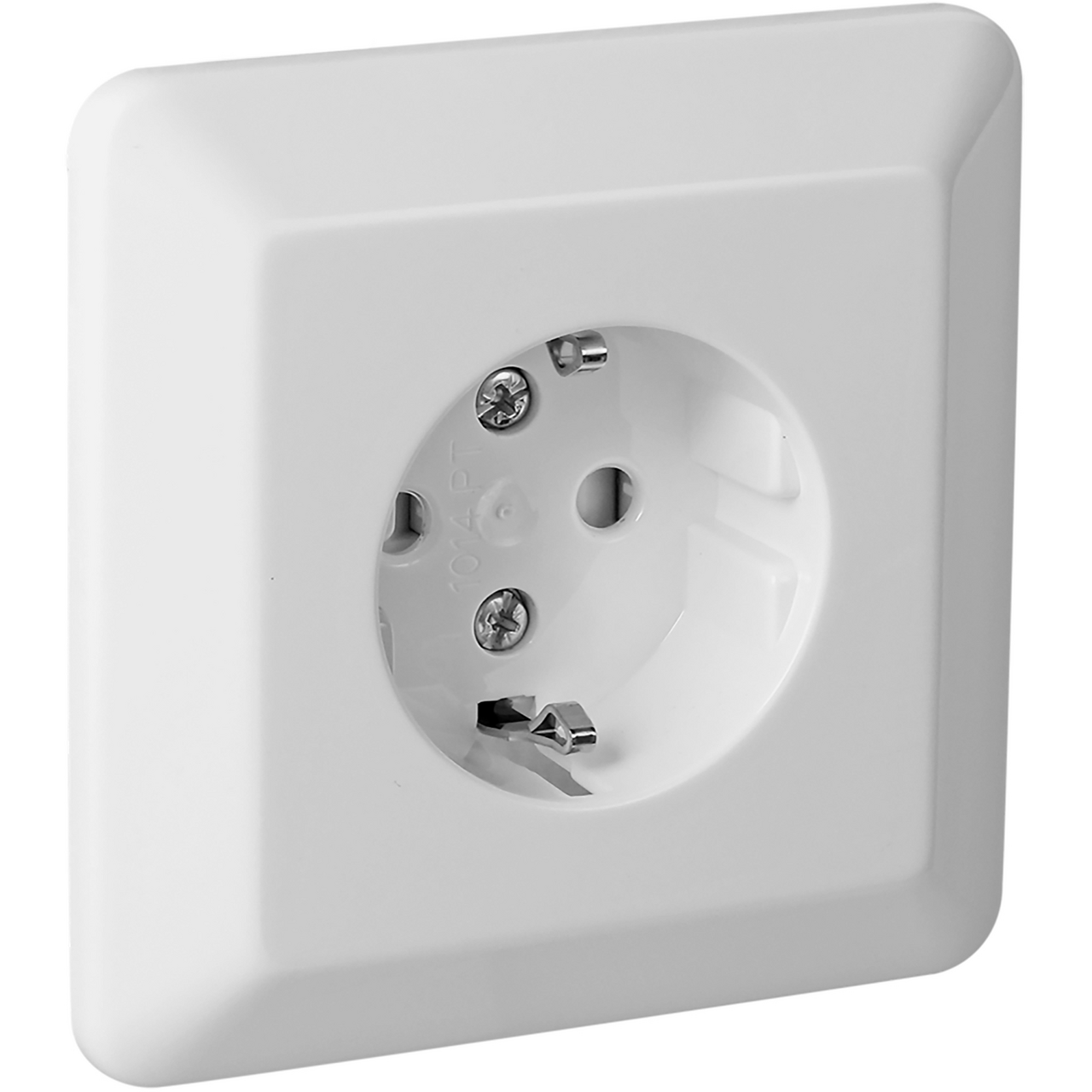 RS Renhvit enkel stikkontakt innfelt med skruklemme. Stikkontakten leveres med hel dekkplate, og kan ikke kombineres med flerhullsrammer.