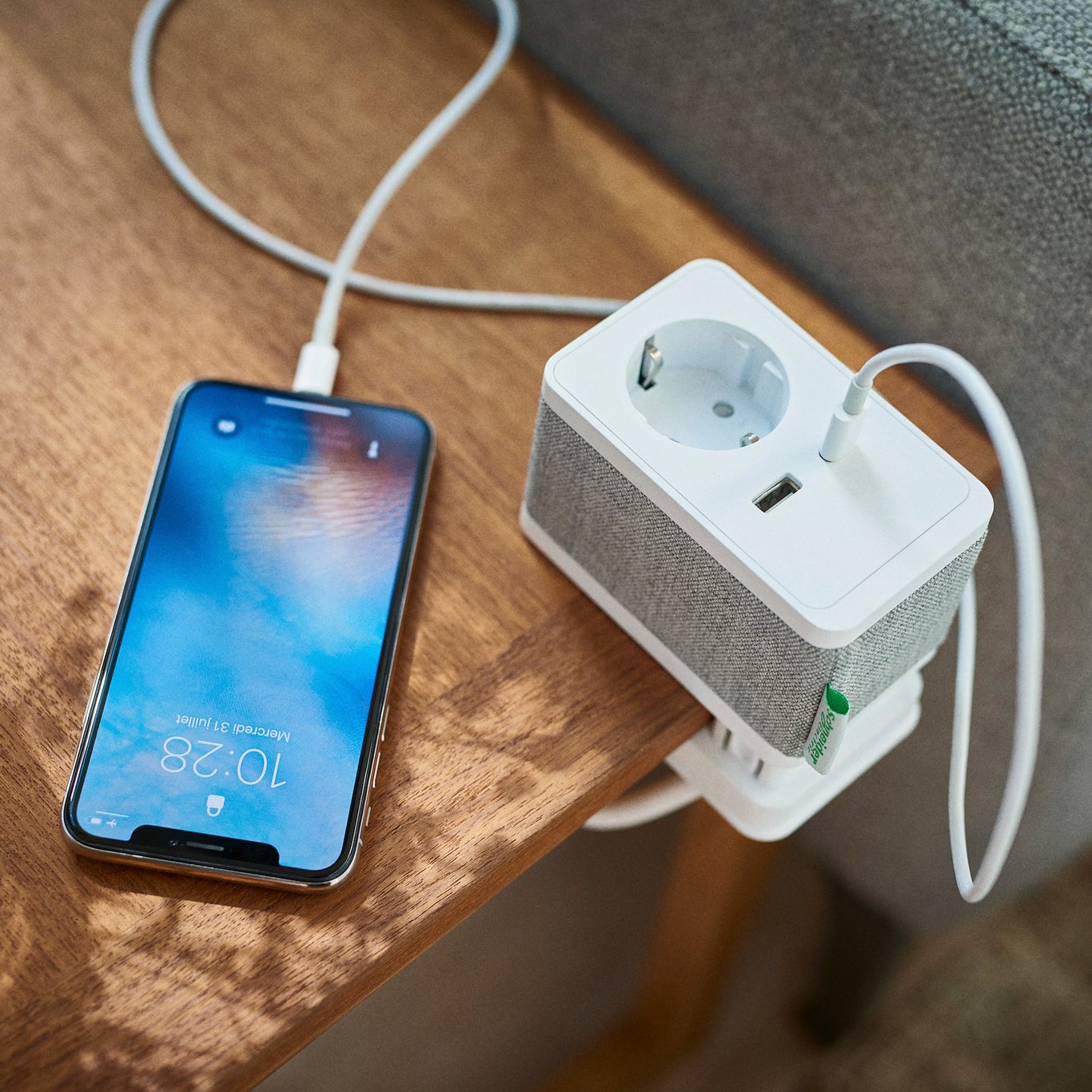 Den leveres med stikkontakt (side jordet), og uttak for USB-A og USB-C. En elastisk stopp er montert på selve bordenheten for å håndtere kabelen, og den er forhåndskoblet med 2 meter kabel og plugg for direkte tilkobling til strøm.