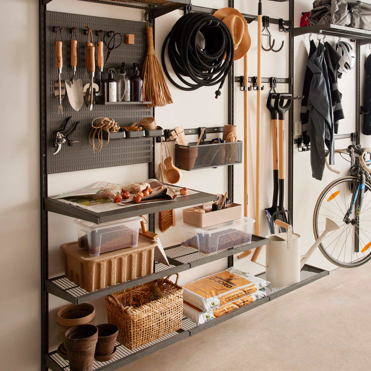 Arbeidshyllen er en robust del av Elfa Garage+ og egner seg godt som lett arbeidsflate i garasje, bod eller hobbyrom. Den monteres i systemet og gir et funksjonelt sted for oppbevaring, sortering og lettere arbeidsoppgaver. Hyllen klikkes enkelt fast i en Garage+ knekt D: 52.
