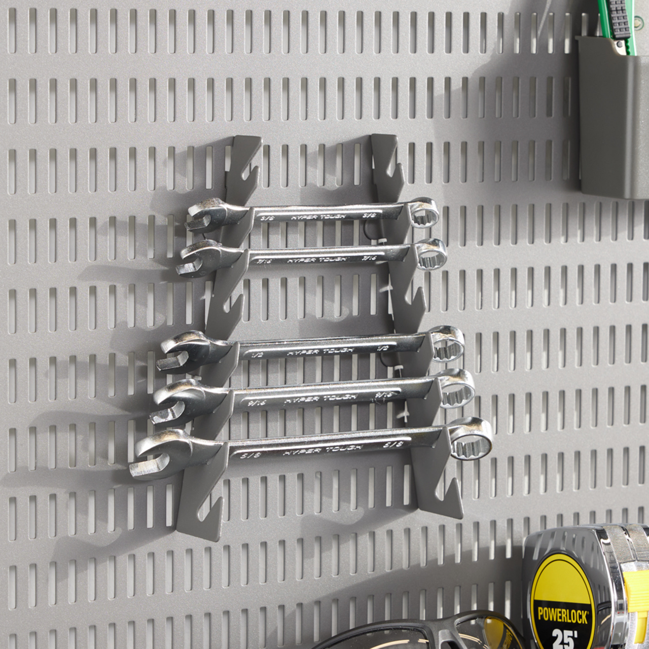 Holder til fastnøkler for Elfa Garage+ oppbevaringstavle som gir oversiktlig verktøyoppbevaring.