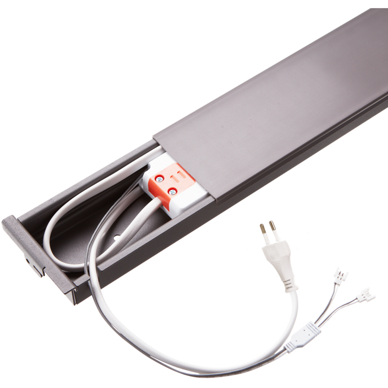 Kabelboksen monteres mellom standardskinner i Elfa Garage+ og brukes til å skjule kabler og tilkoblinger til belysningen. Den er et godt valg når du ønsker en mer diskret og ordentlig lysinstallasjon.
