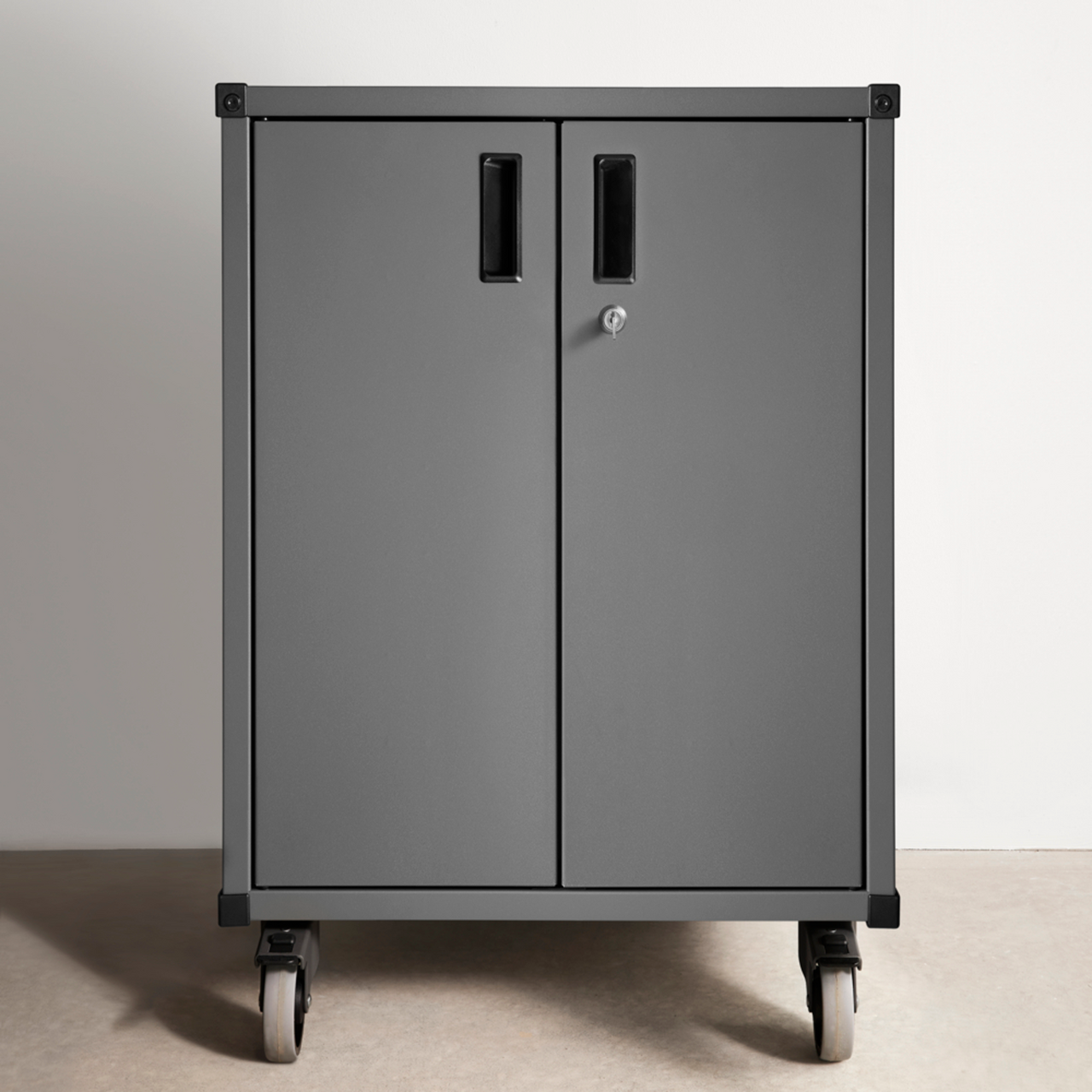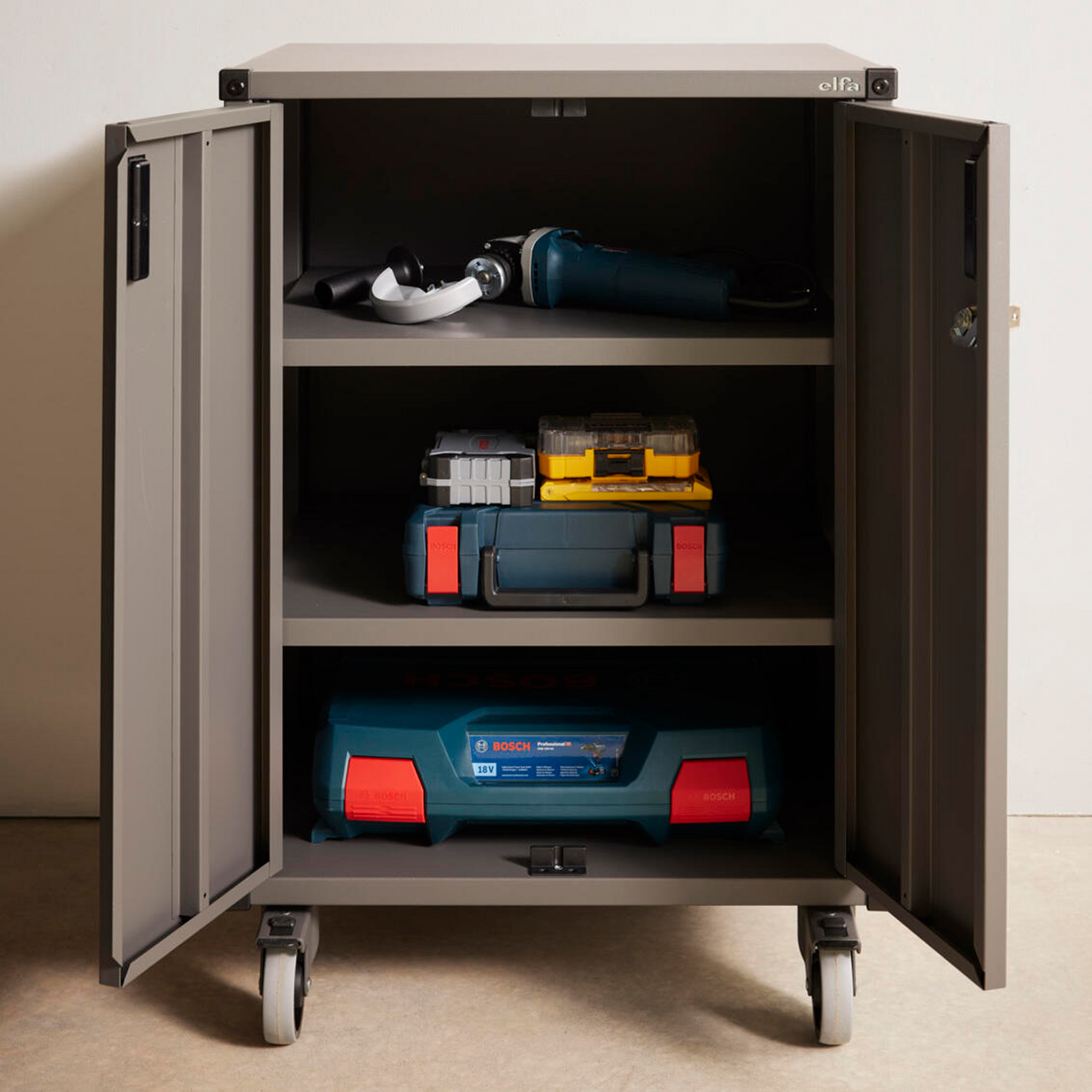 Dette komplette underskapsettet er en praktisk løsning når du ønsker mer lukket oppbevaring i garasje eller bod. Løsningen er utviklet for Elfa Garage+ og egner seg godt til verktøy, utstyr og andre ting du vil oppbevare samlet og beskyttet. Kan monteres på Garage+ hengeskinner eller på hjul eller føtter. En komplett underskapspakke, inkludert stamme, dører og en hylle for ryddig oppbevaring. Robust stålkonstruksjon med hjørnebeskyttelse i PP-plast.