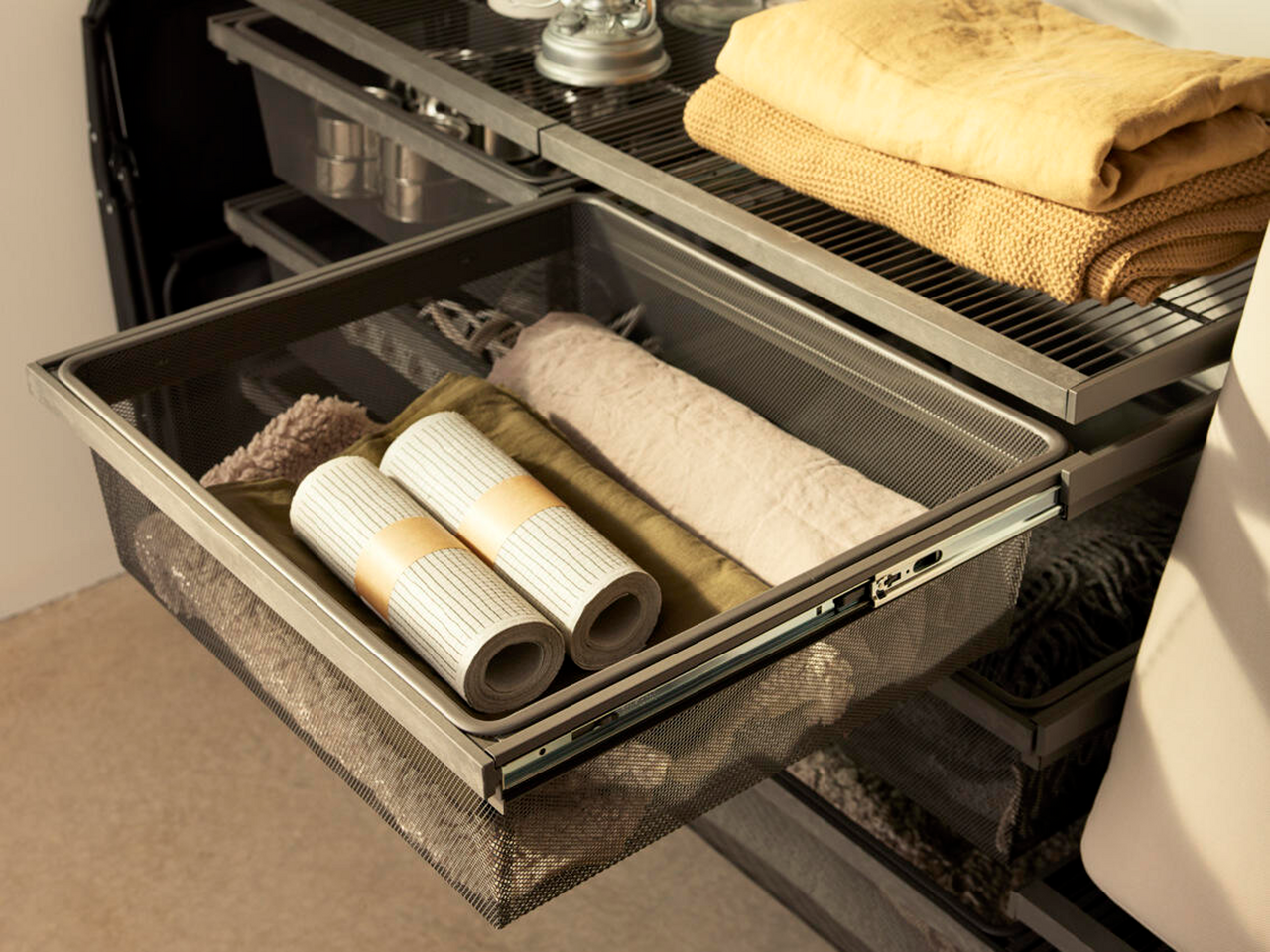 Meshkurv til Elfa Garage+ som gir luftig og oversiktlig oppbevaring i uttrekksramme.