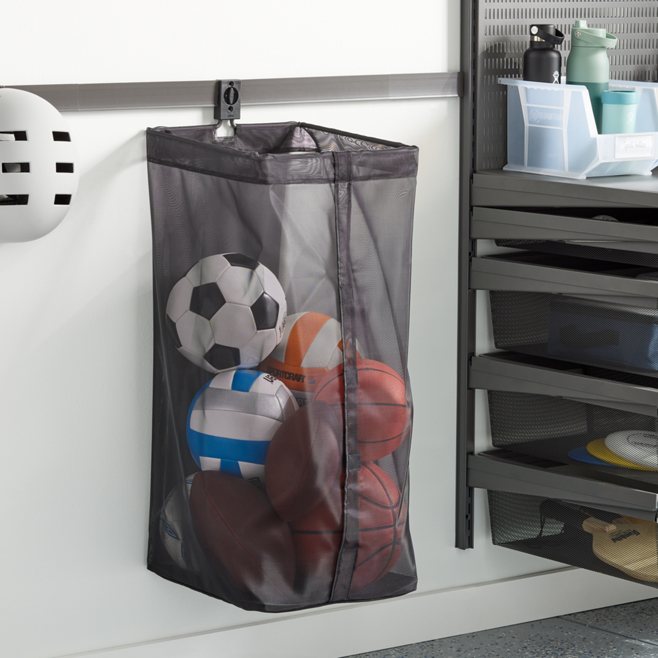 Oppbevaringsbag i mesh til Elfa Garage+ for ryddig oppbevaring av større og lettere gjenstander.