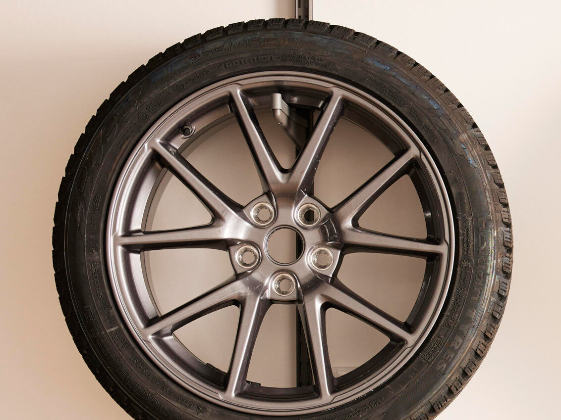 Denne dekkoppbevaringspakken fra Elfa gjør det enkelt å lagre dekkene dine på veggen.