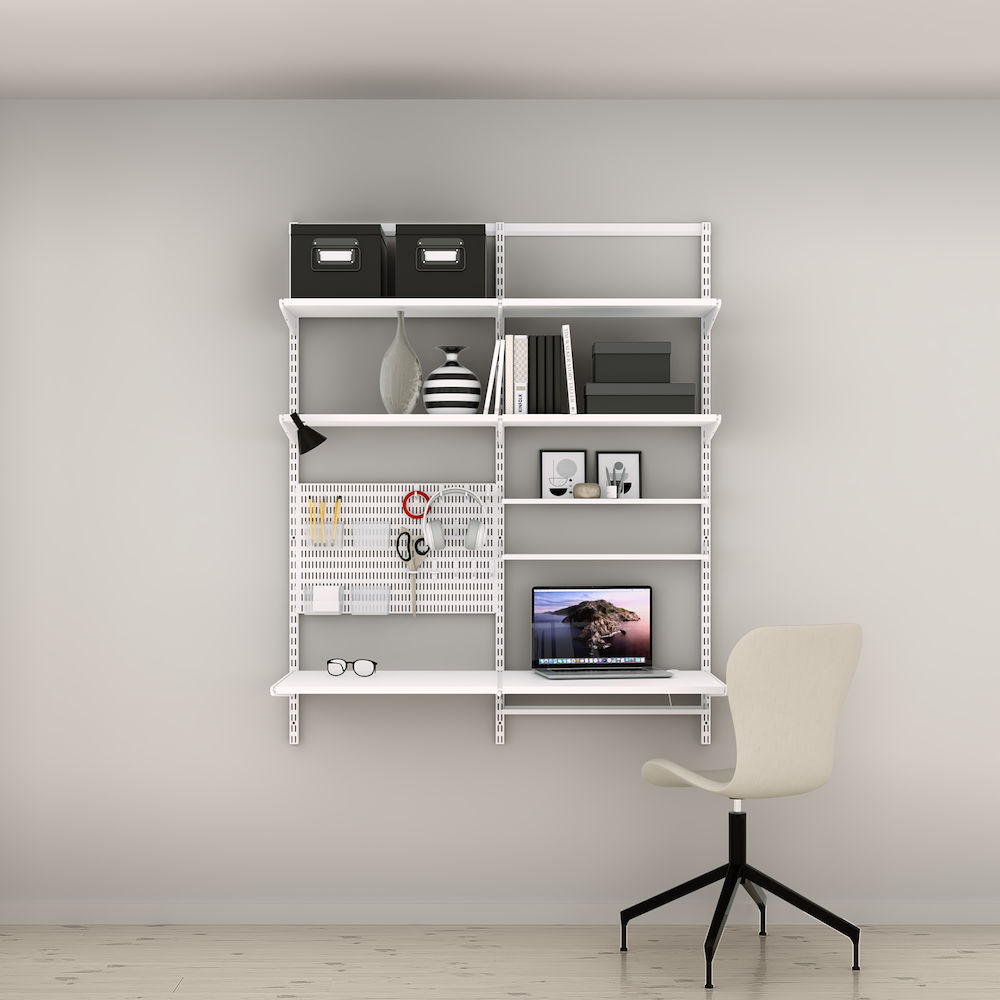 Denne komplette løsningen inneholder bærelist, hengeskinner, klikk-inn melaminhyller, vendbar metallhylle og knekter.